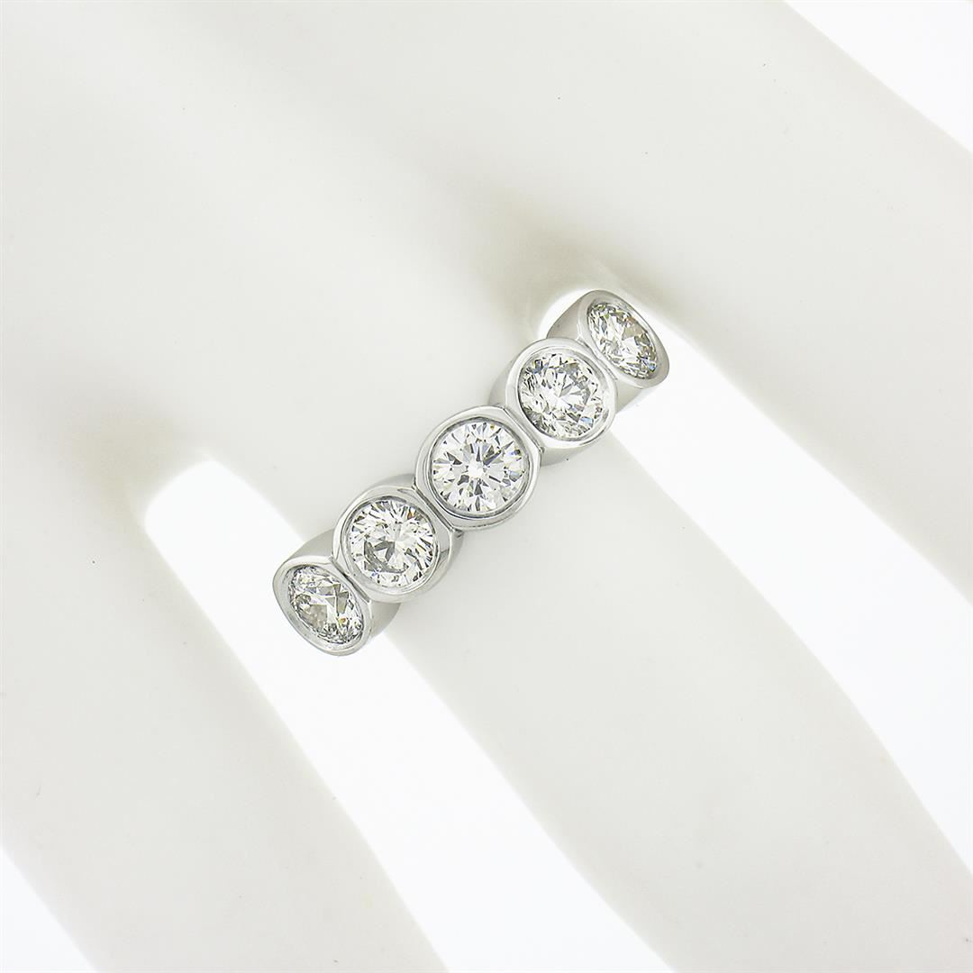 A new solid platinum band ring, with 5 round brilliant cut natural diamonds ( F/G - VS1/VS2 ; 1.19ctw). The ring is size 5.5, weighs a total of 8.13 grams, and measures 5.15mm wide.
