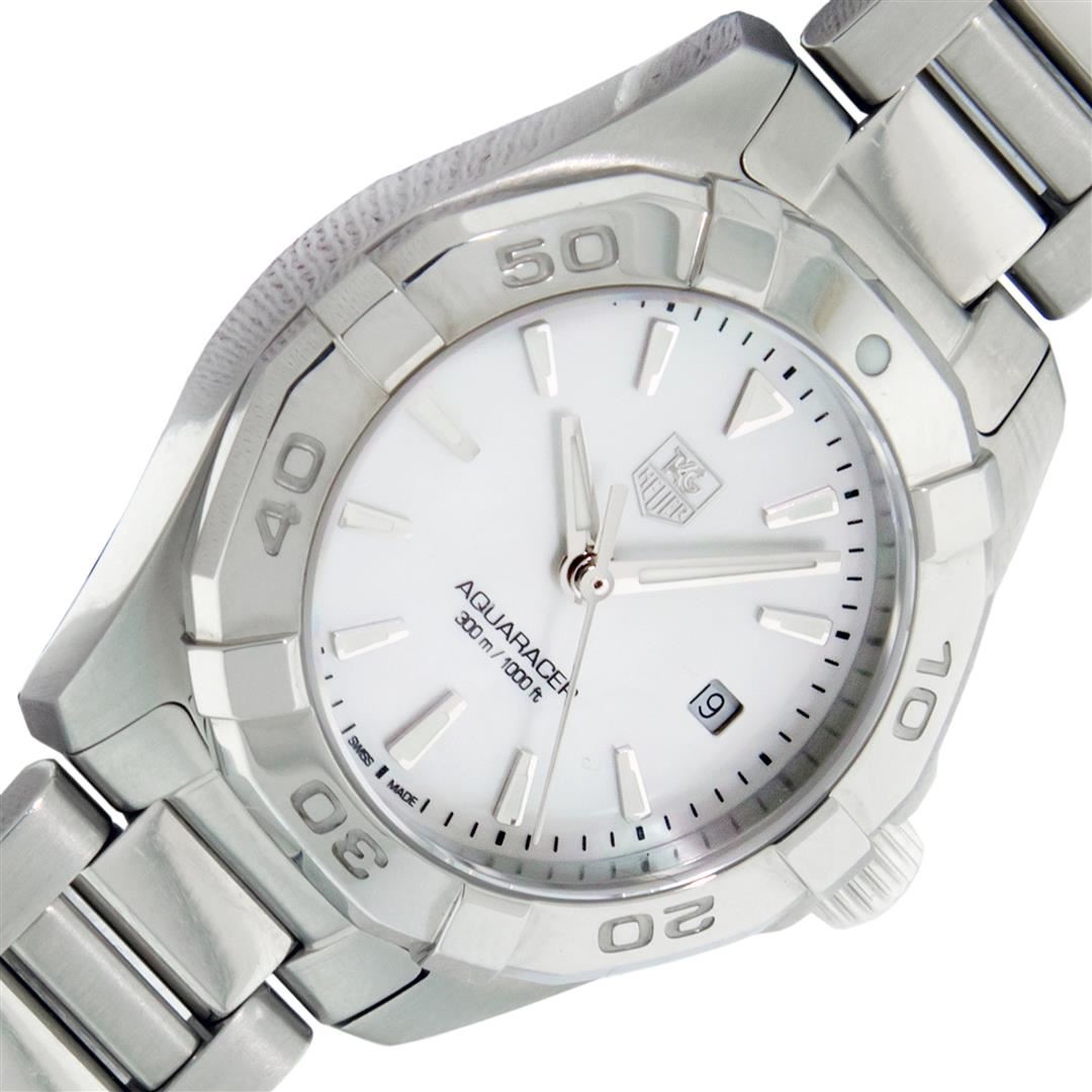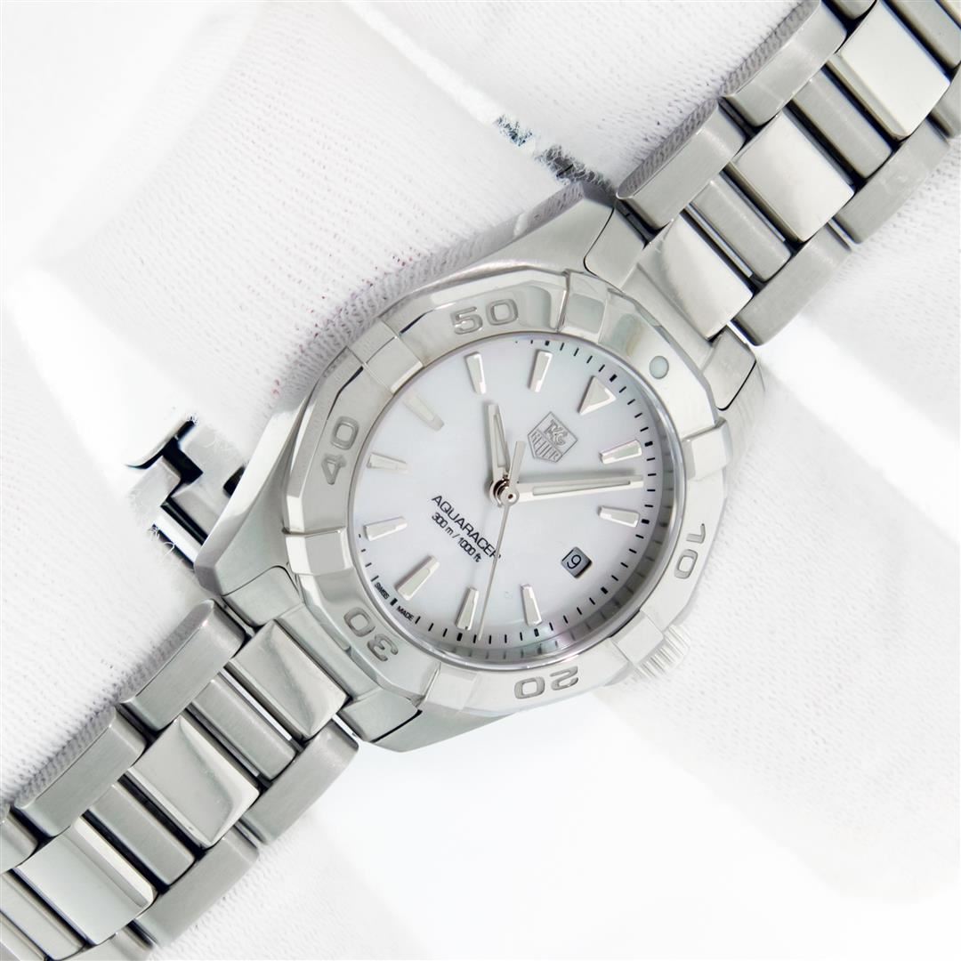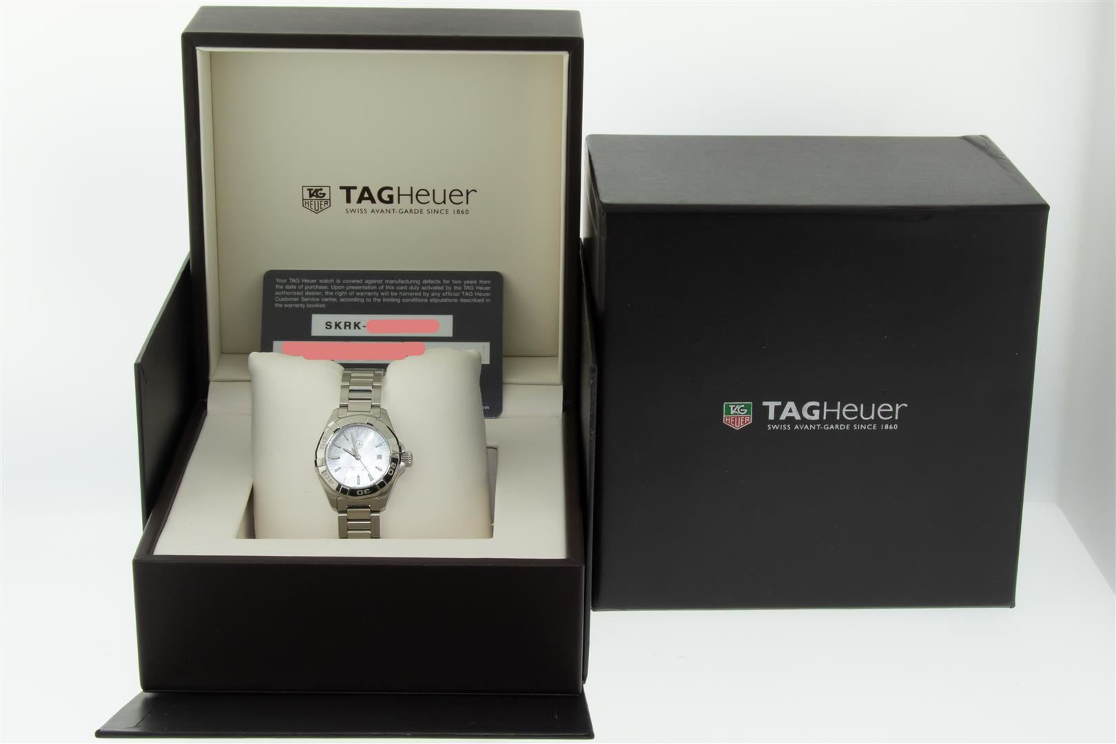 One New Ladies Tag Heuer Stainless Steel Aquaracer. This Watch Is Brand New, Stainless Steel Case: 27mm, Tag Heuer Stainless Steel Crown. Tag Heuer Bezel: Stainless Steel Rotating Bezel, Tag Hehuer Crystal: Sapphire Crystal. Tag Heuer Hands: Tag Heuer Luminiscent Hands, Movement: Tag Heuer Movement, Dial: Tag Heuer Mother Of Pearl Dial, Window: 3 O'Clock Position Date Display, Model: TAG Heuer Aquaracer. Condition: NEW Excellent. Bracelet: Tag Heuer Stainless Steel Band. Fits Up To 7 Inch Wrist, Adjustable. Standard Fold Clasp with Tag Heuer Logo. It Is Free Of All Scratches And Dents. This Watch Is Brand New And Comes With Tag Heuer Card And Box.