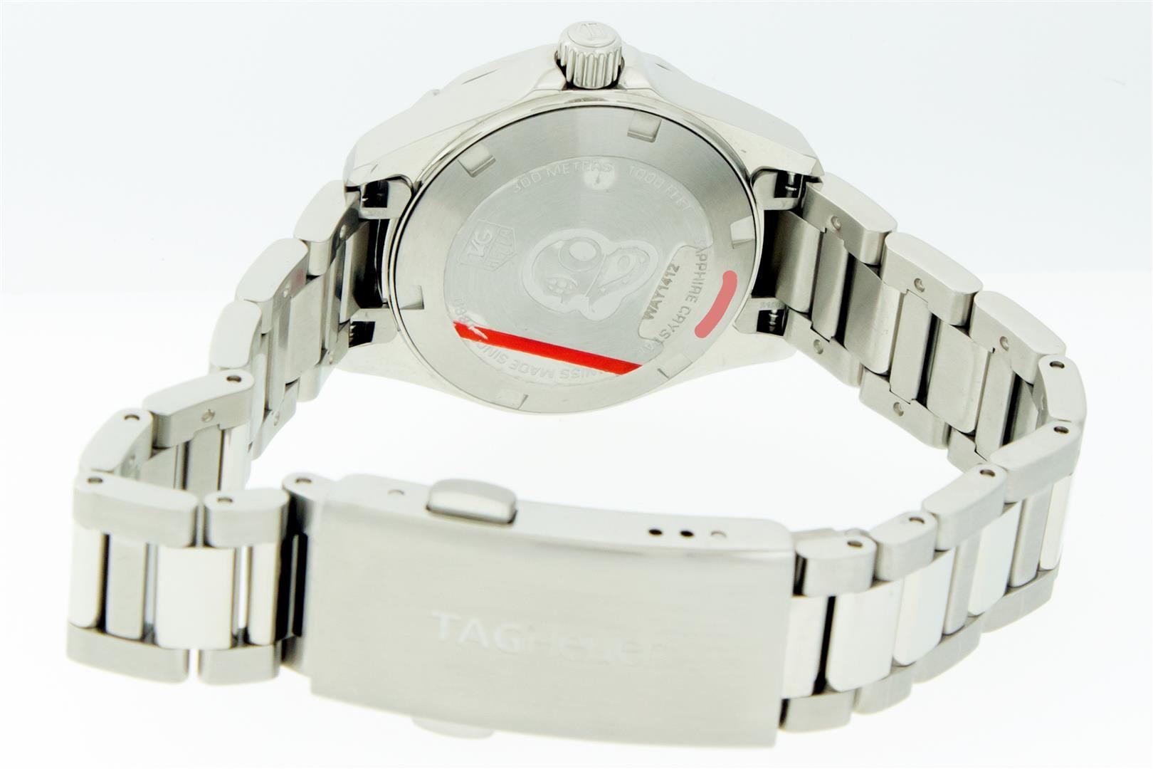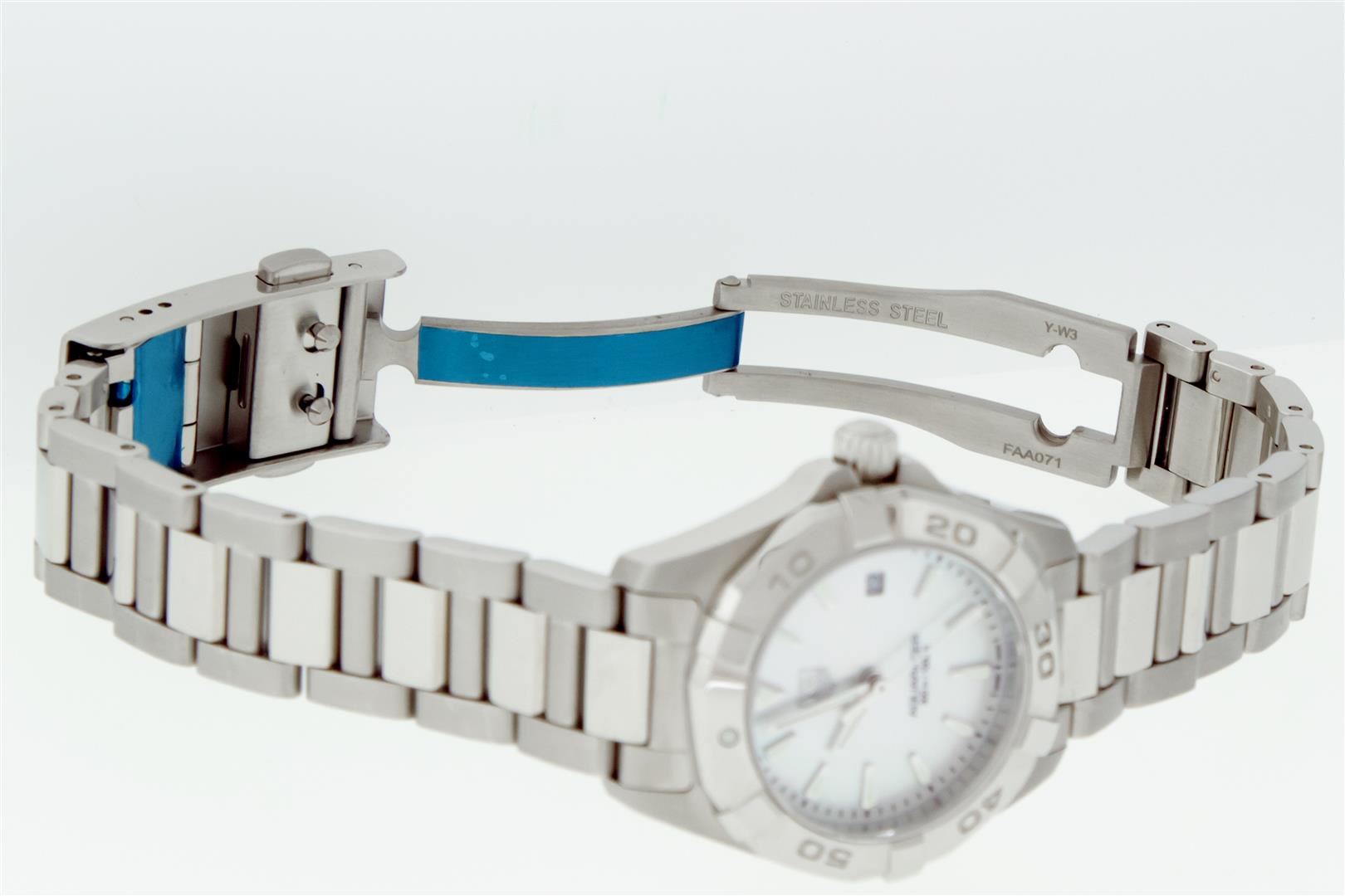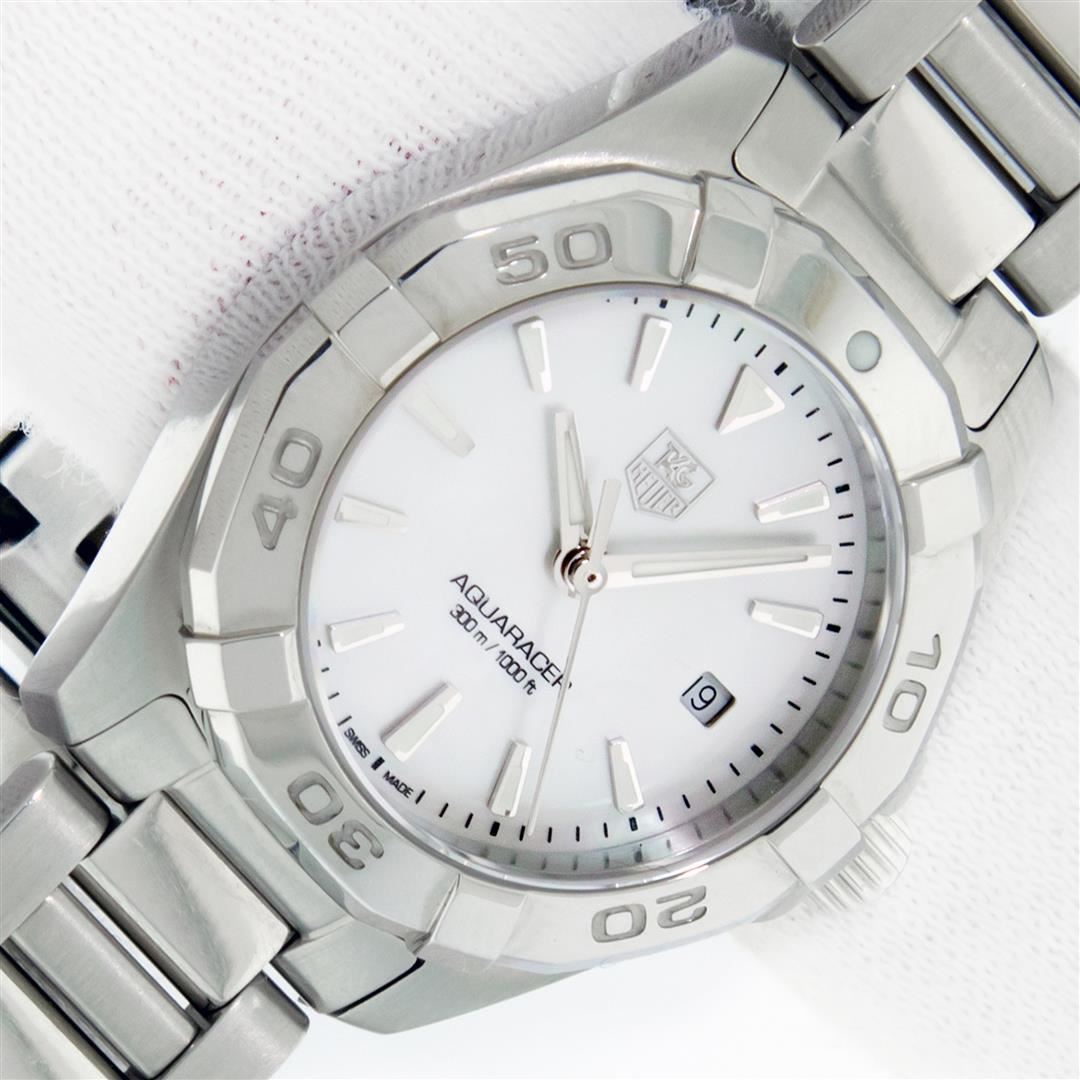 One New Ladies Tag Heuer Stainless Steel Aquaracer. This Watch Is Brand New, Stainless Steel Case: 27mm, Tag Heuer Stainless Steel Crown. Tag Heuer Bezel: Stainless Steel Rotating Bezel, Tag Hehuer Crystal: Sapphire Crystal. Tag Heuer Hands: Tag Heuer Luminiscent Hands, Movement: Tag Heuer Movement, Dial: Tag Heuer Mother Of Pearl Dial, Window: 3 O'Clock Position Date Display, Model: TAG Heuer Aquaracer. Condition: NEW Excellent. Bracelet: Tag Heuer Stainless Steel Band. Fits Up To 7 Inch Wrist, Adjustable. Standard Fold Clasp with Tag Heuer Logo. It Is Free Of All Scratches And Dents. This Watch Is Brand New And Comes With Tag Heuer Card And Box.