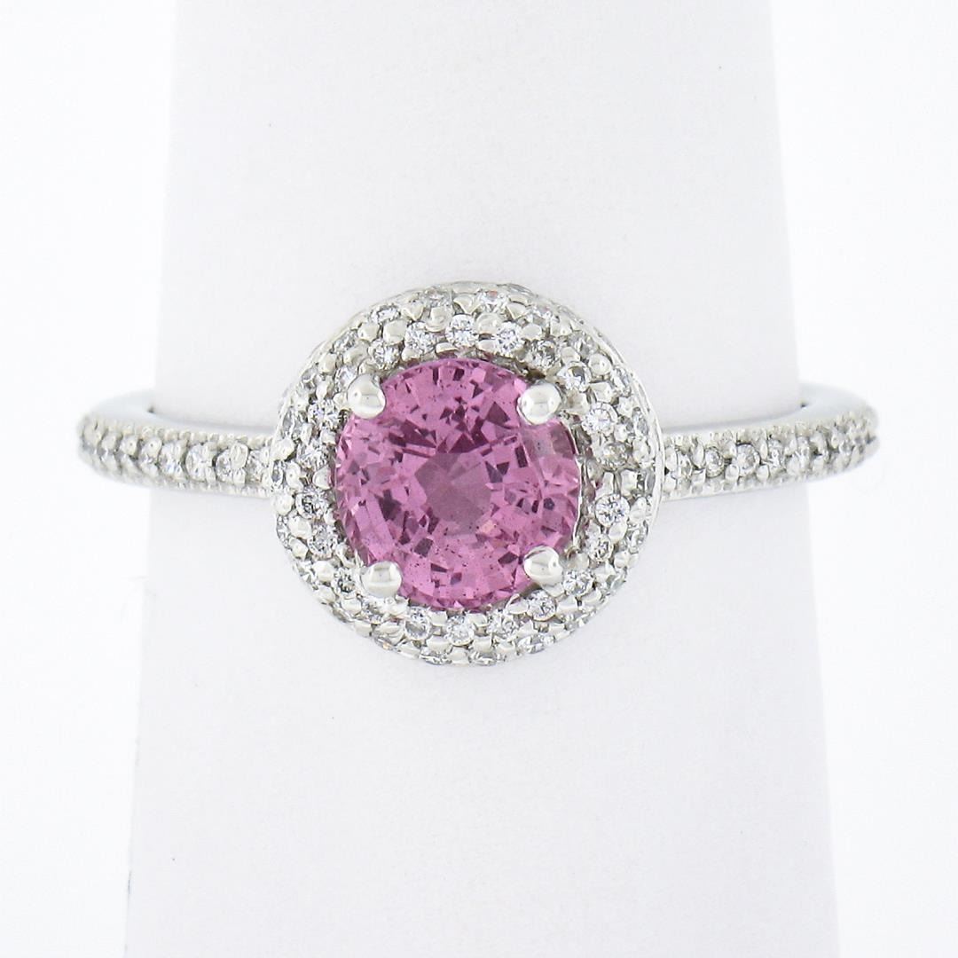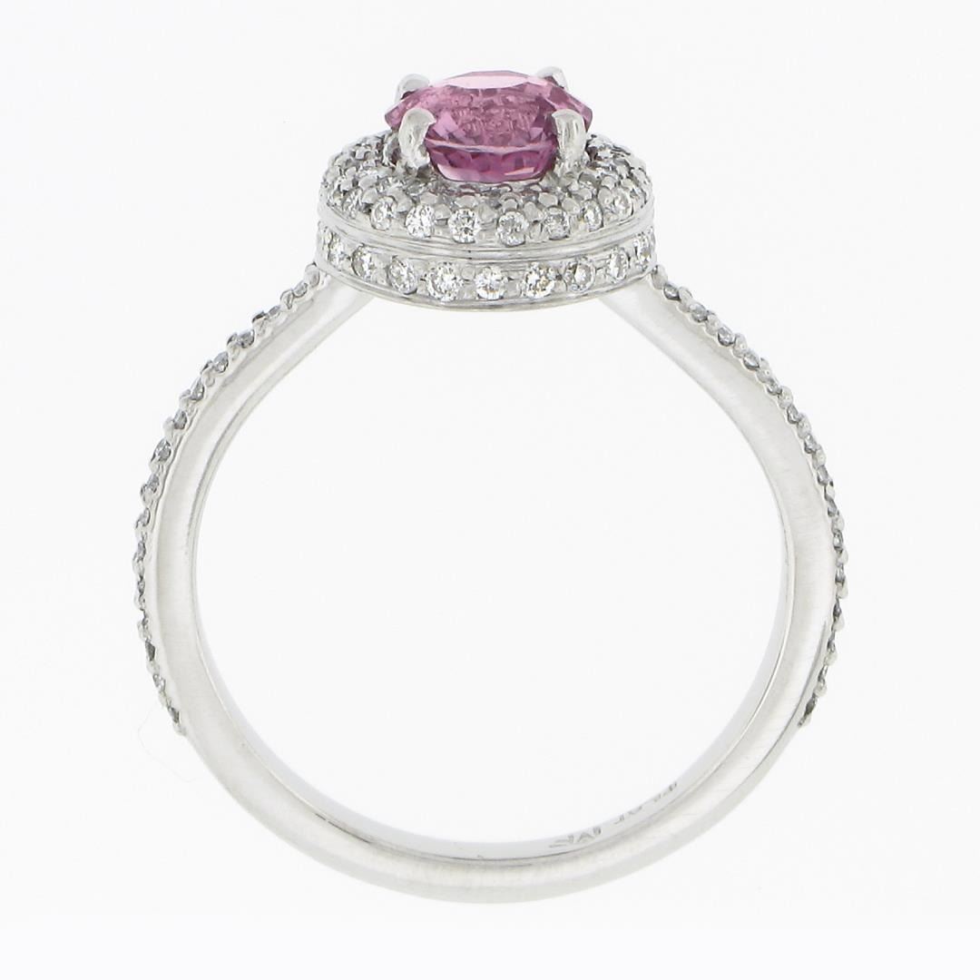 A new solid platinum ring by Martin Flyer, with 1 round brilliant cut natural pink sapphire (1.07ct), surrounded with a halo of numerous round brilliant cut natural diamonds (G - VS1/VS2 ; 0.50ctw). The ring is size 6.5, weighs a total of 4.75 grams, and measures 9.50mm wide.