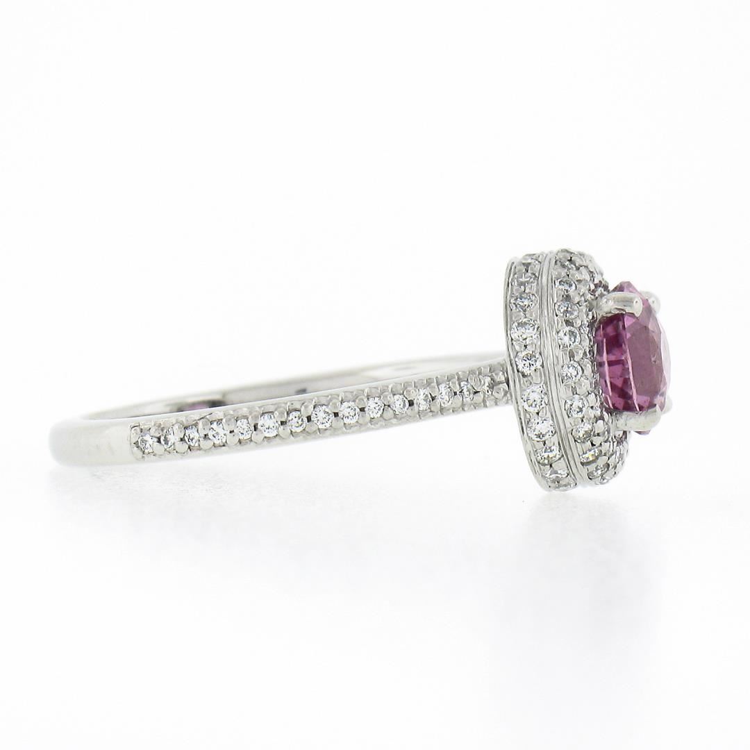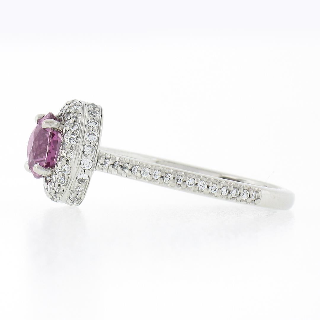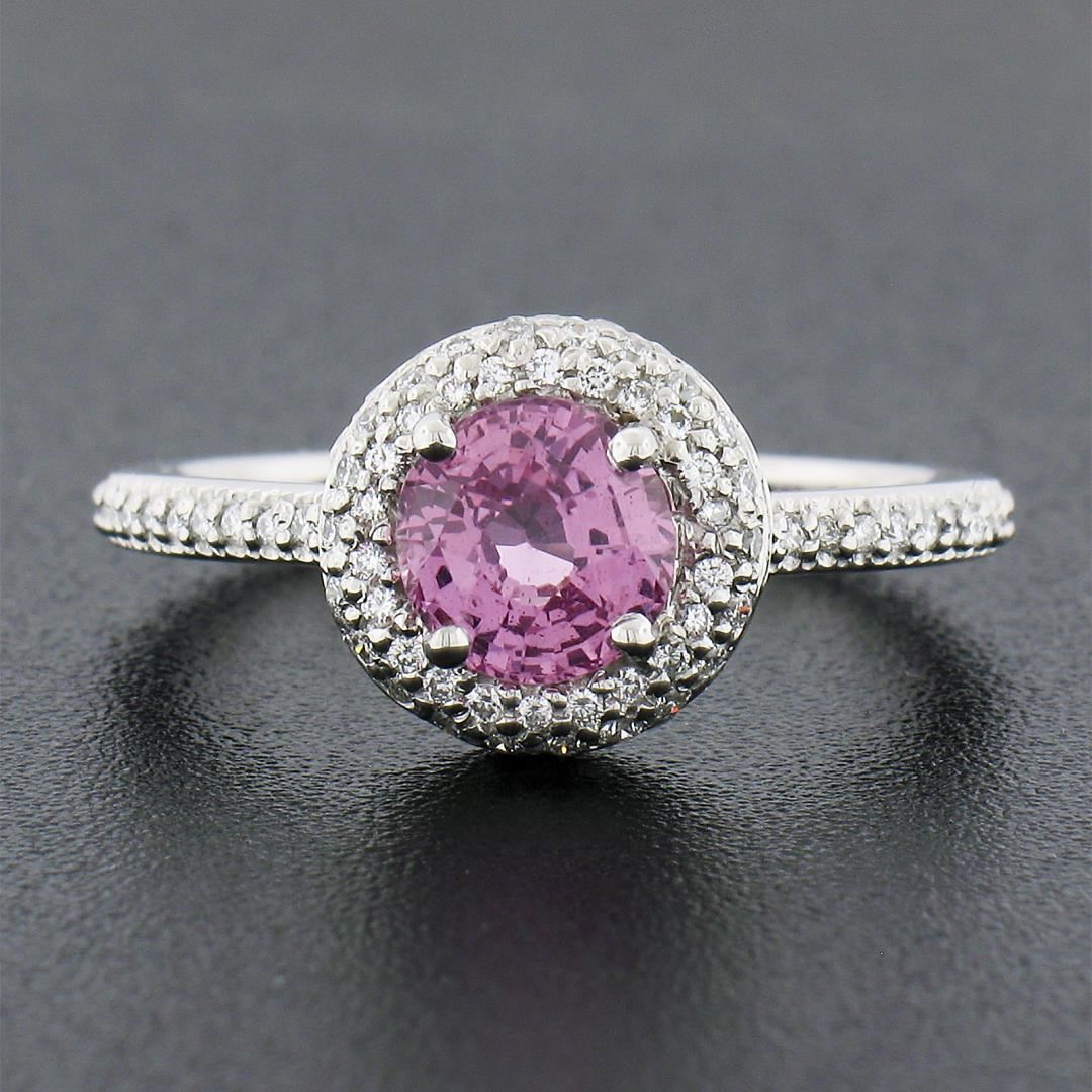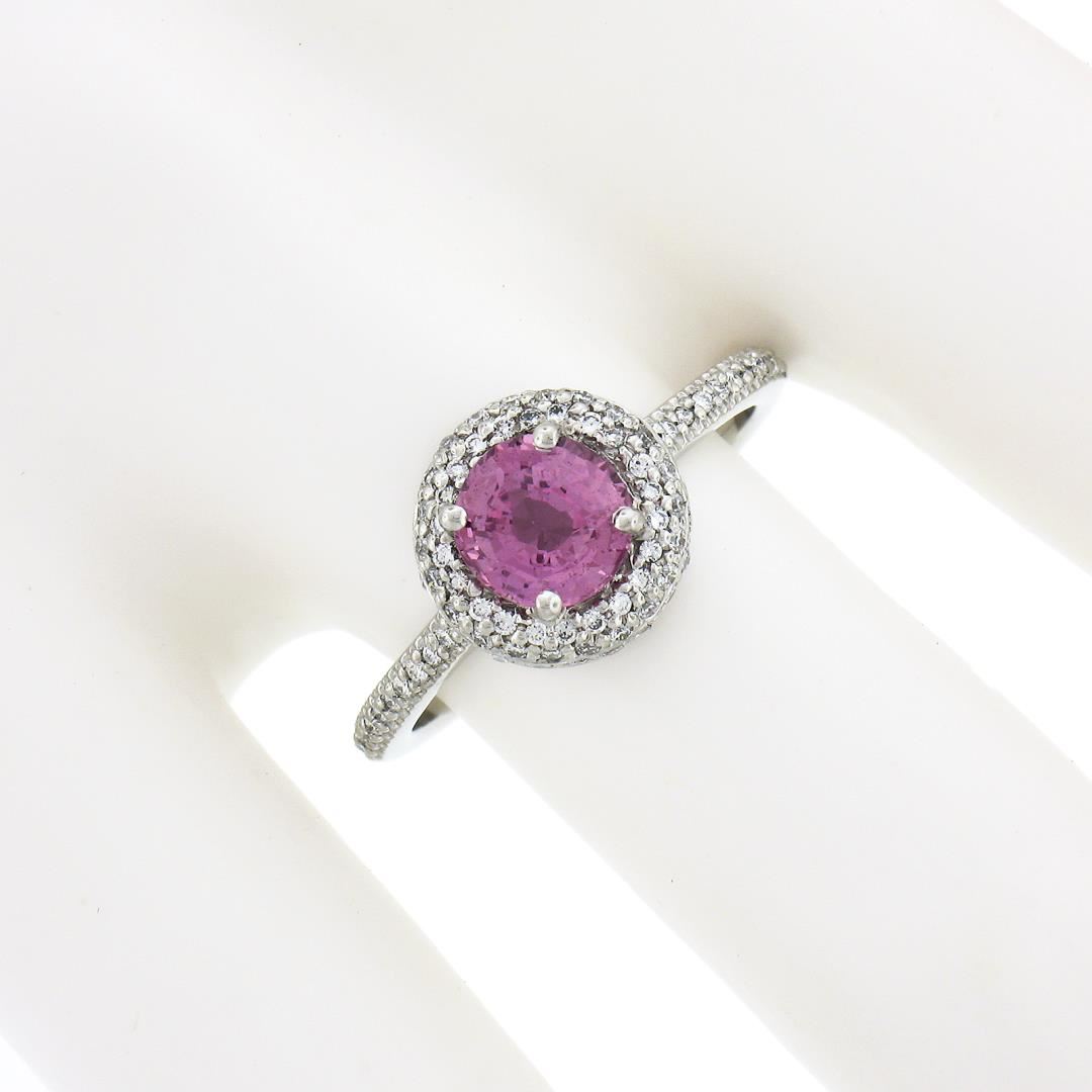 A new solid platinum ring by Martin Flyer, with 1 round brilliant cut natural pink sapphire (1.07ct), surrounded with a halo of numerous round brilliant cut natural diamonds (G - VS1/VS2 ; 0.50ctw). The ring is size 6.5, weighs a total of 4.75 grams, and measures 9.50mm wide.