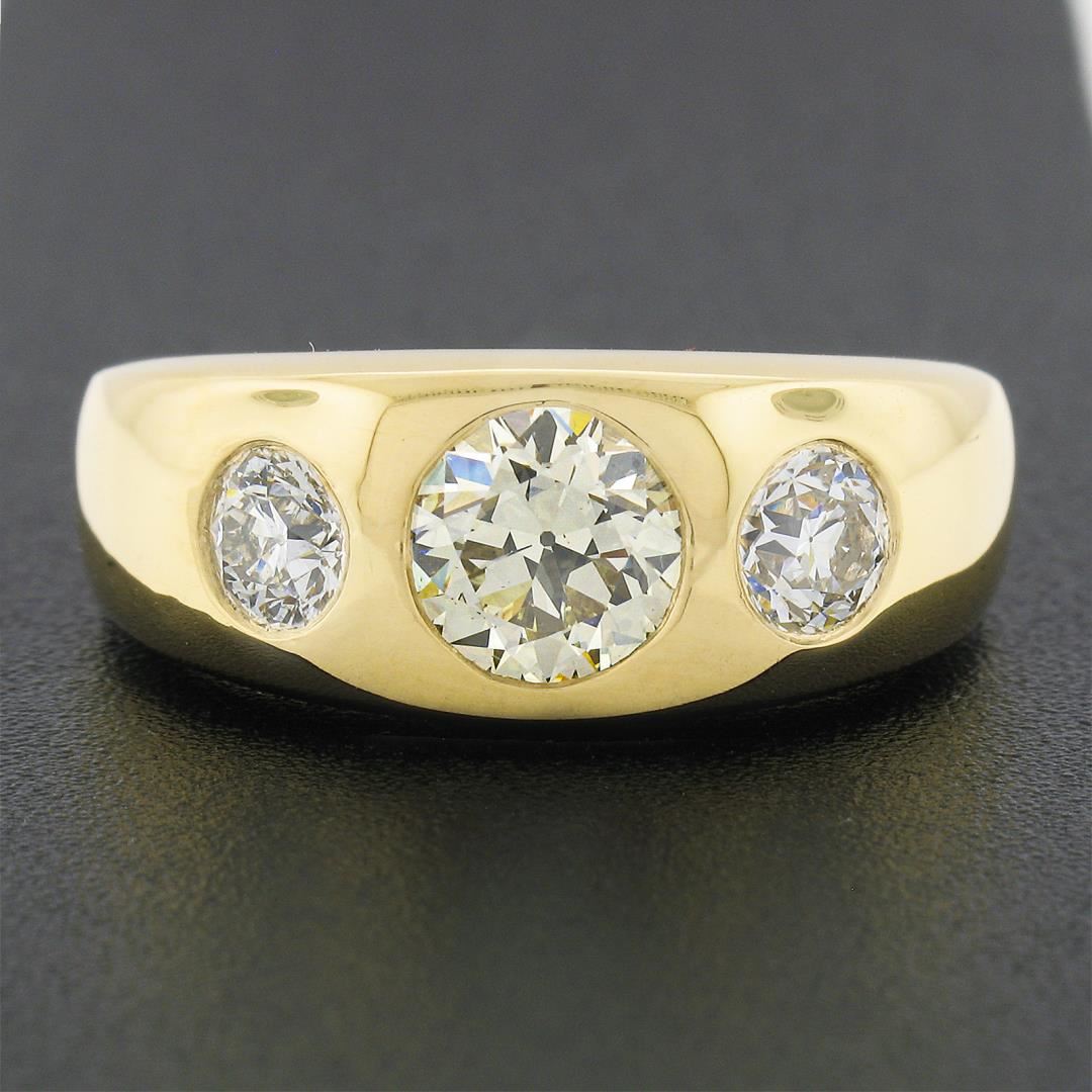 A new soliod 18k yellow gold band ring, with 1 GIA graded old european cut natural diamond (S/T - VS2 ; 1.14ct), and 2 old european cut natural diamonds (H/I - VS2/SI1 ; 0.82ctw). The ring is size 9.0, weighs a total of 10.56 grams, and measures 9.1mm wide. Comes with all original relevant certifications.