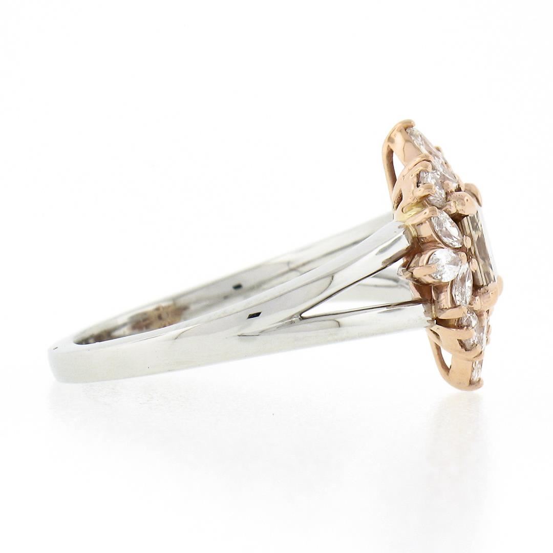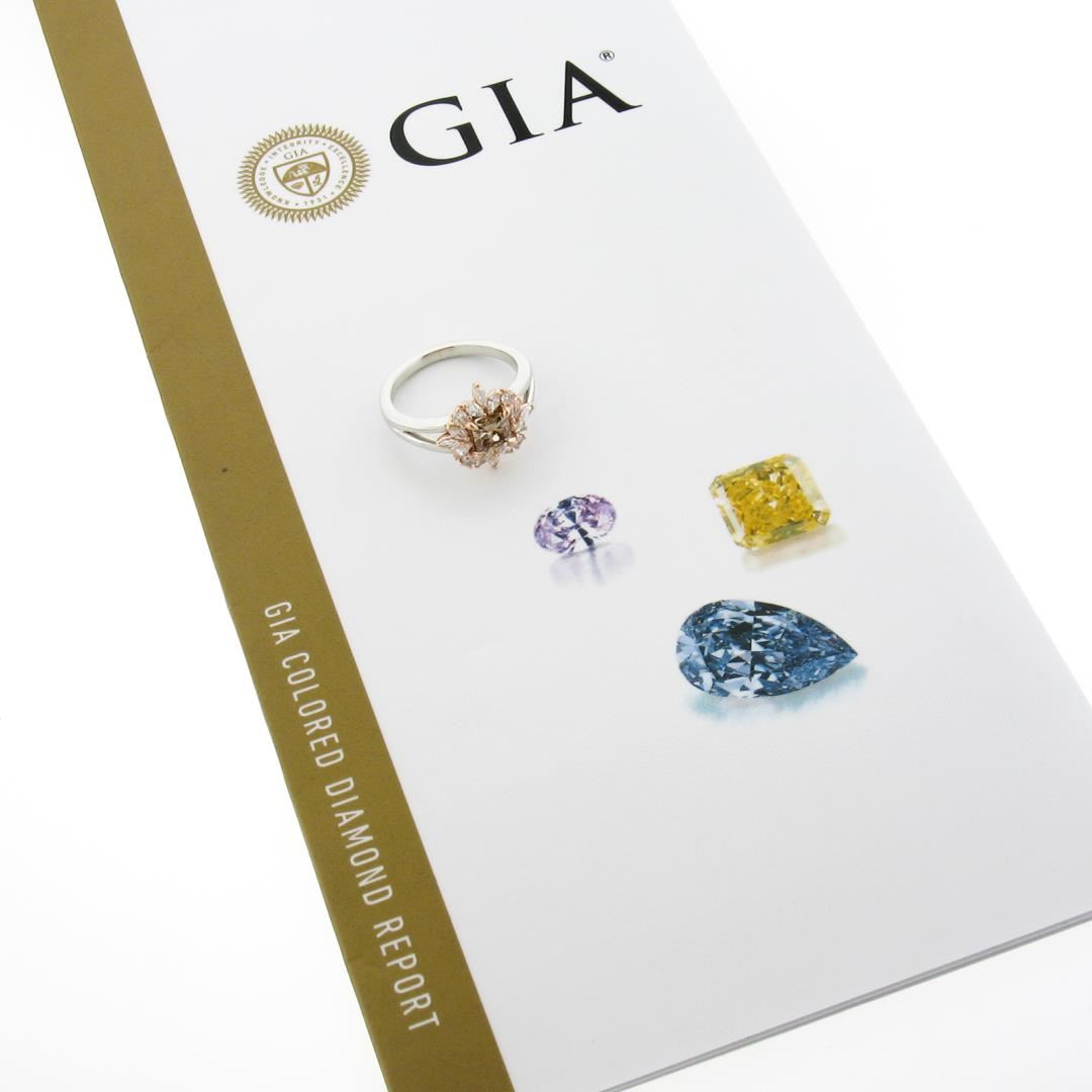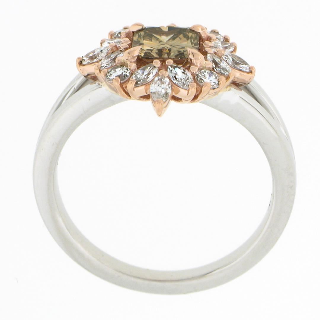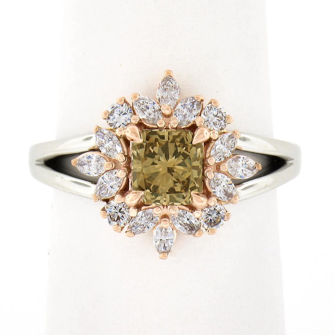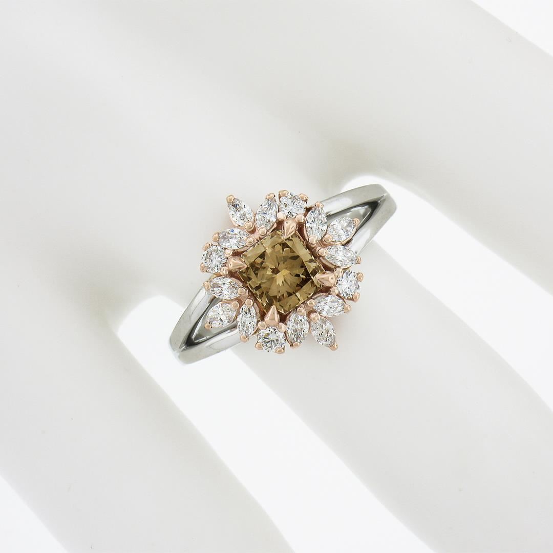 A new platinum solitaire ring, with 1 GIA graded fancy yellow brown radiant cut natural diamond ( VS2 ; 0.78ct), and 12 marquise cut natural diamonds (G/H - VS1/VS2 ; 0.34ctw), with 4 round brilliant cut natural diamonds (G/H - VS1/VS2 ; 0.14ctw). The ring is size 6.5, weighs a total of 5.92 grams, and measures 13.80mm wide. Comes with all original relevant certifications.