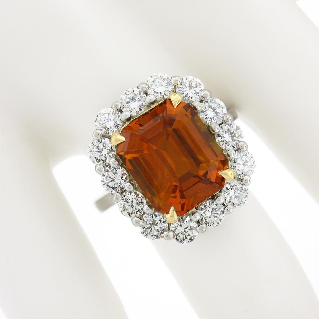 A new solid platinum & 18k yellow gold cocktail ring, featuring 1 GIA graded emerald step cut natural orange sapphire (8.61ct), surrounded with a halo of 14 round cut natural diamonds (F/G - VS1/VS2 ; 2.13ctw). The ring is size 6.0, weighs a total of 13.29 grams, and measures 19.5mm wide. Comes with all original relevant certifications.