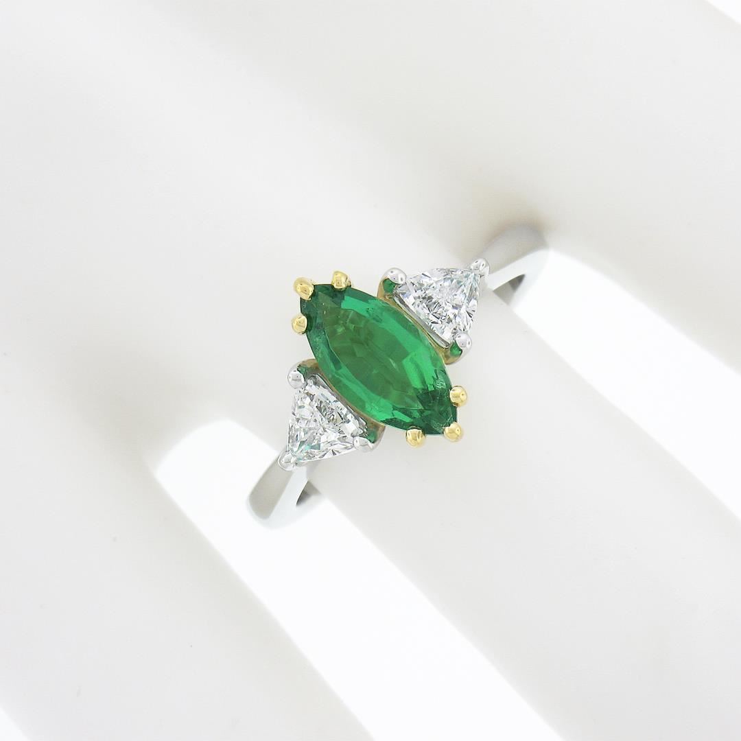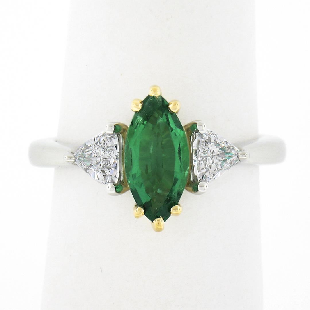 a new solid platinum & 18k yellow gold ring, with 1 GIA graded maquise cut natural emerald (1.00ct ), and 2 trillion cut natural diamonds (F/G - VS1-SI1 ; 0.58ctw). The ring is size 6.0, weighs a total of 6.15 grams, and measures 11.4mm wide. Comes with all original relevant certifications.