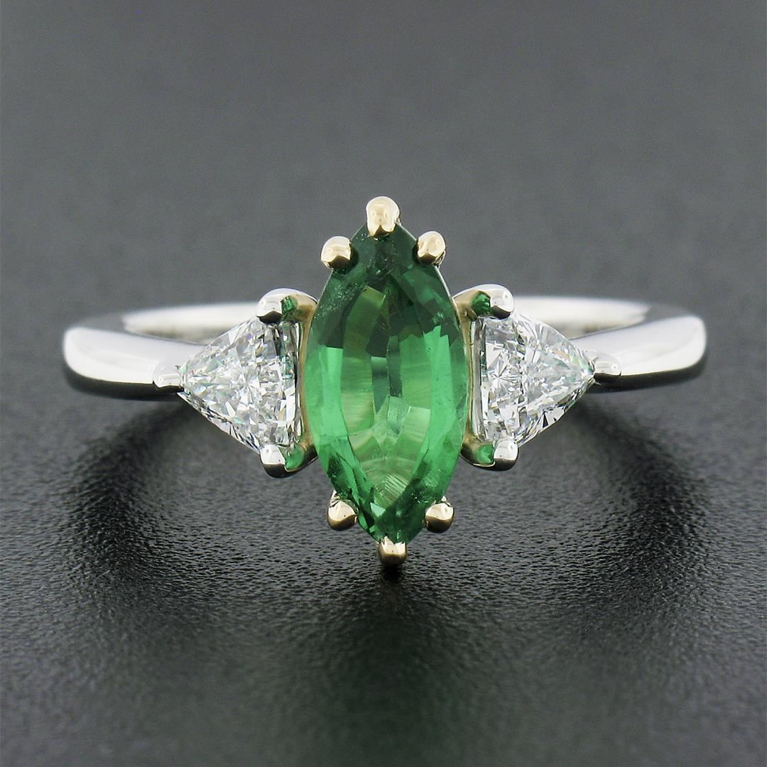 a new solid platinum & 18k yellow gold ring, with 1 GIA graded maquise cut natural emerald (1.00ct ), and 2 trillion cut natural diamonds (F/G - VS1-SI1 ; 0.58ctw). The ring is size 6.0, weighs a total of 6.15 grams, and measures 11.4mm wide. Comes with all original relevant certifications.
