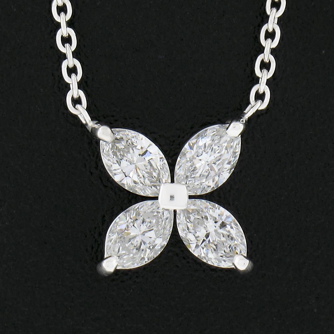 A new solid platinum pendant necklace, with 4 marquise cut natural diamonds (G - VS1/VS2 ; 0.56ctw). Adjustable 16.5 & 18.5 inch cable link chain, 3.97 grams total weight, pendant measures 8.2x8.2mm.