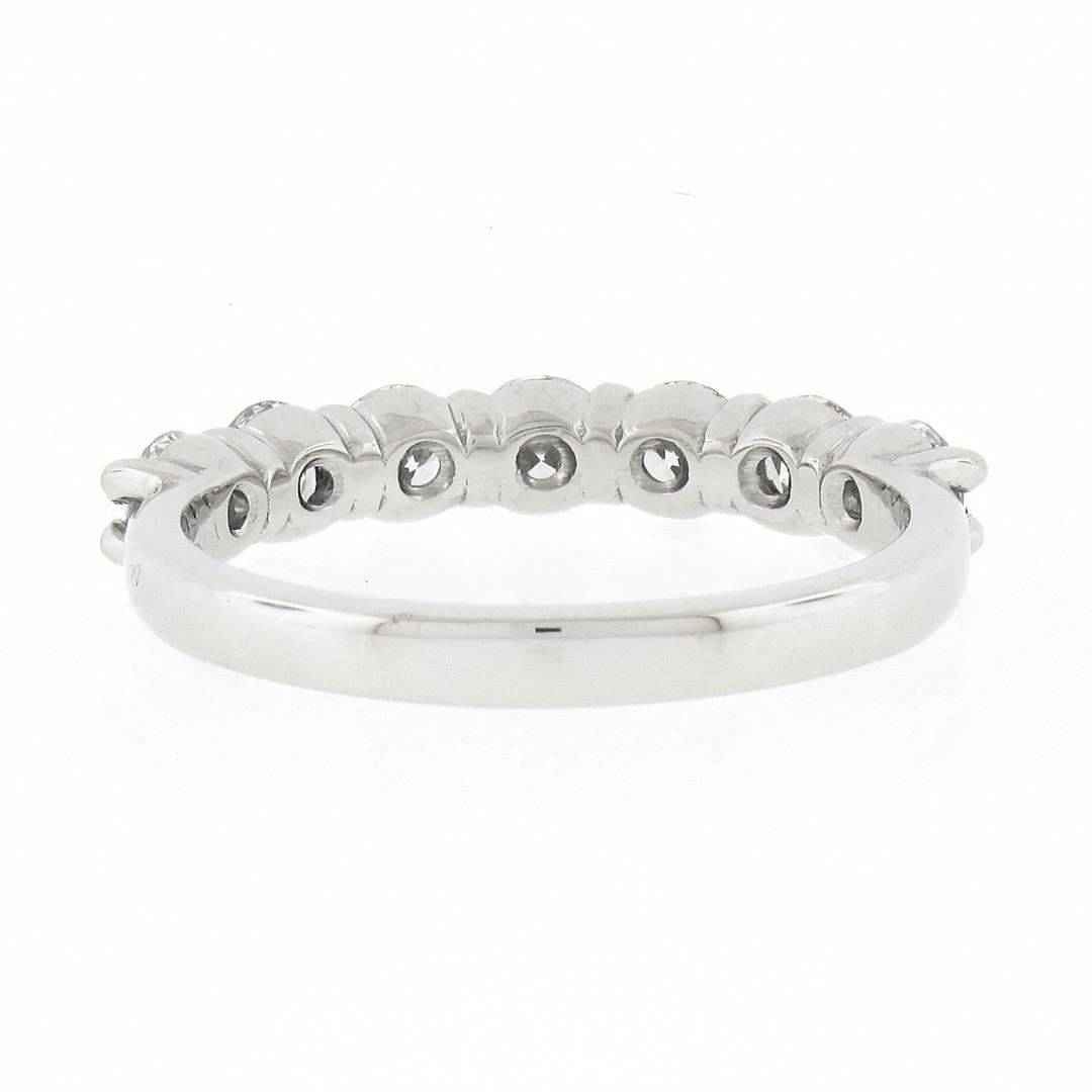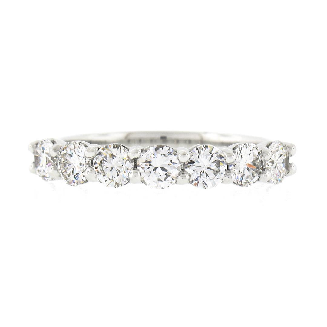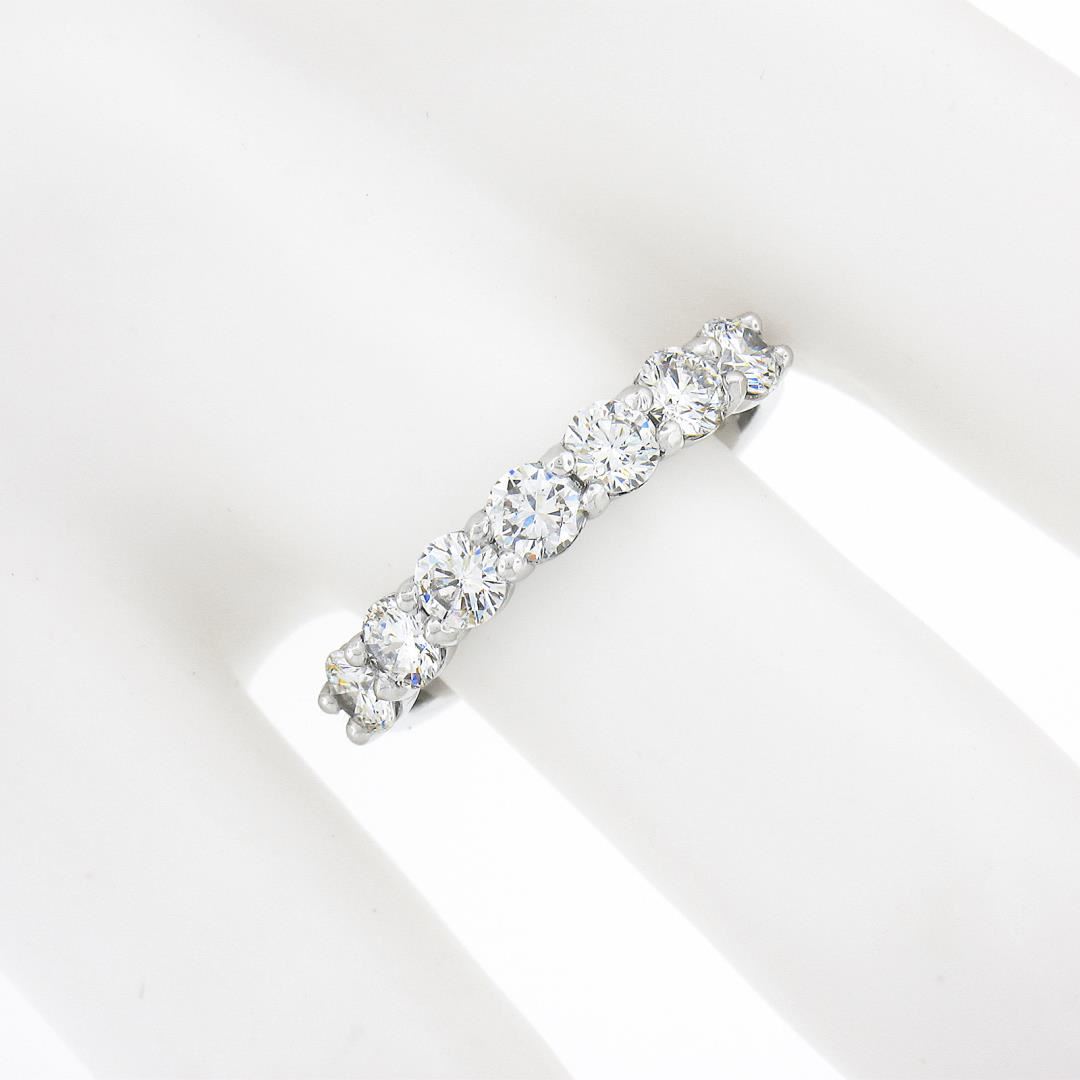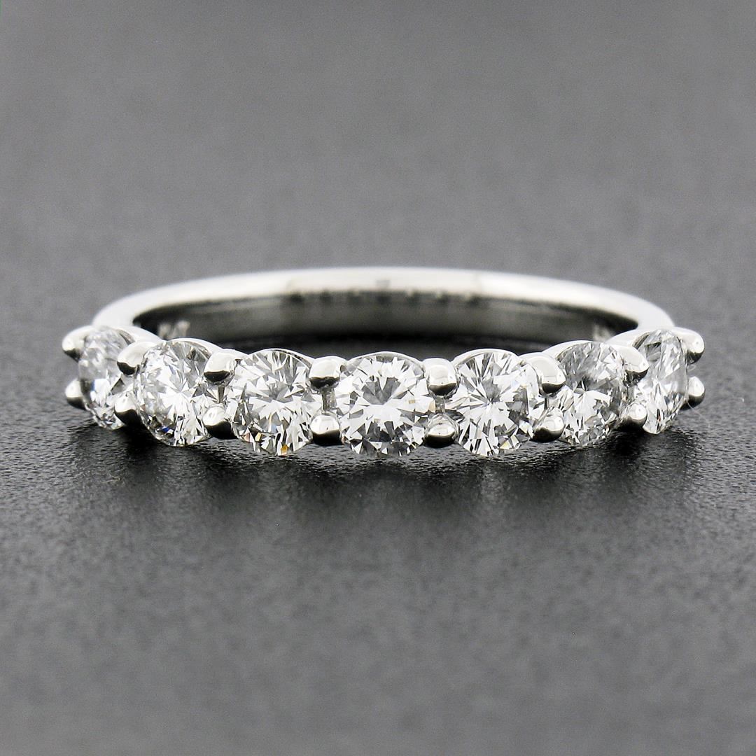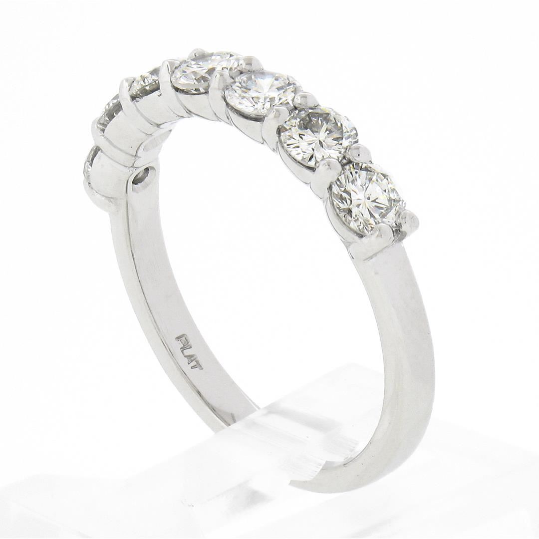 A new solid platinum band ring, with 7 round brilliant cut natural diamonds (F/G - VS1/VS2; 1.12ctw). The ring is size 7.0, weighs a total of 4.61 grams, and measures 3.55mm wide.