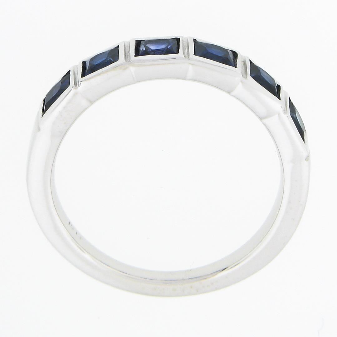 A new solid platinum band ring, with 6 square step cut natural sapphires (1.18ctw). The ring is size 6.5, weighs a total of 6.01 grams, and measures 4.1mm wide.