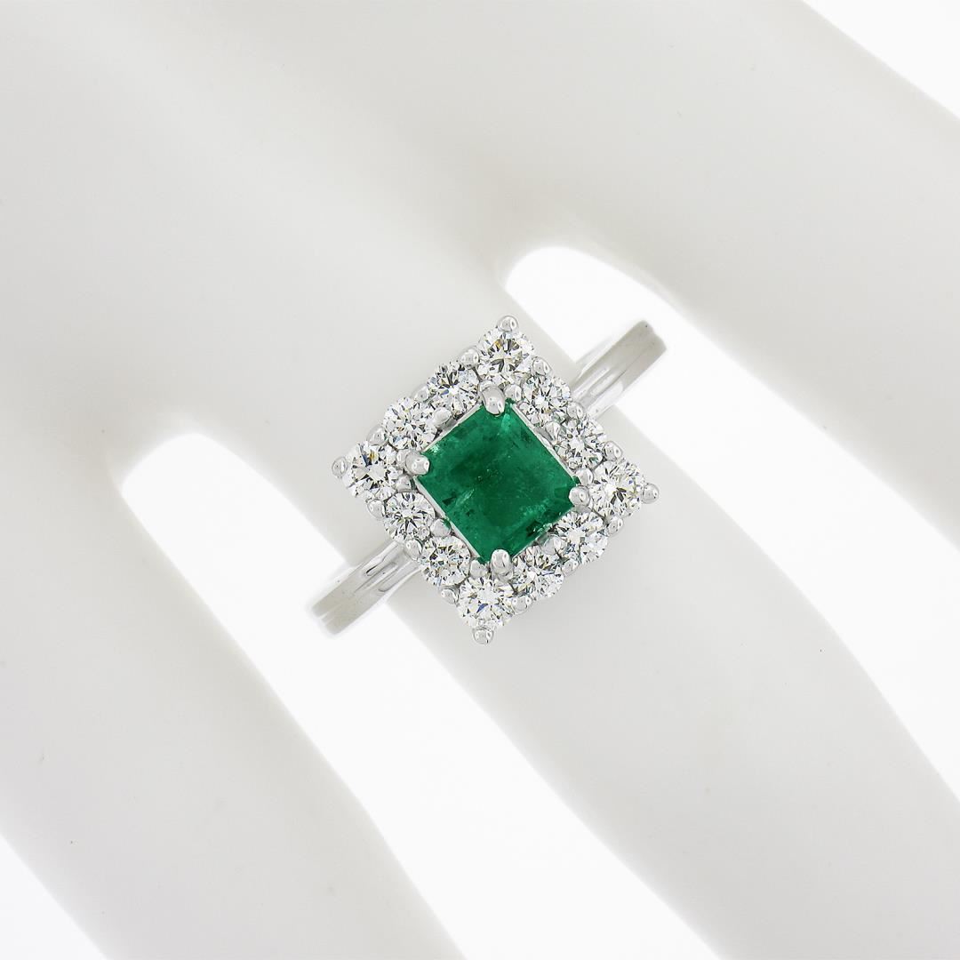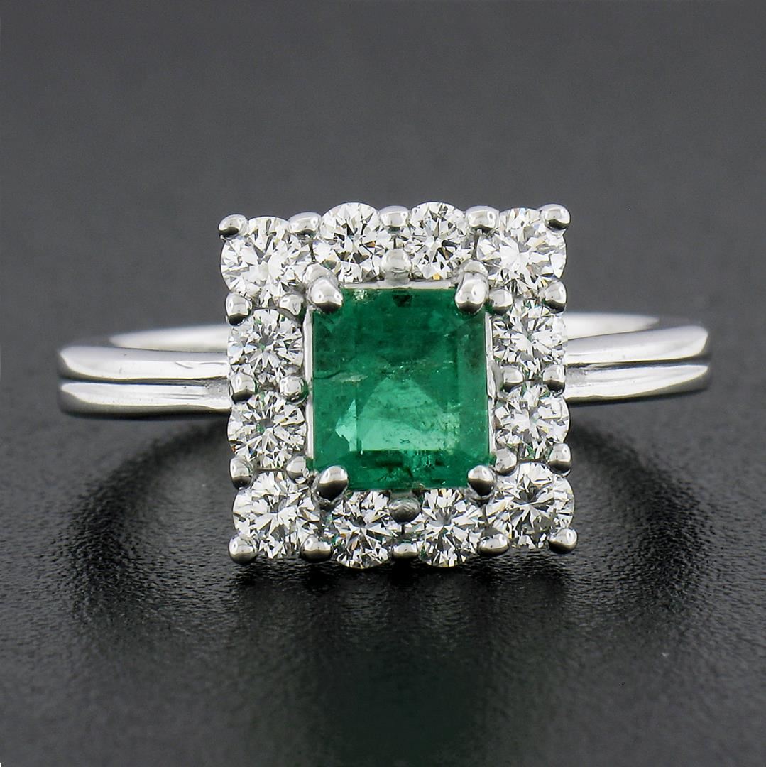 A new solid platinum Ring, with 1 GIA graded octagonal step cut natural emerald (0.82ct ), surrouned with a halo of 12 round cut natural diamonds (G-I - VS2/SI1 ; 0.69ctw). The ring is size 6.5, weighs a total of 7.23 grams, and measures 10.9mm wide. Comes with all original relevant certifications.