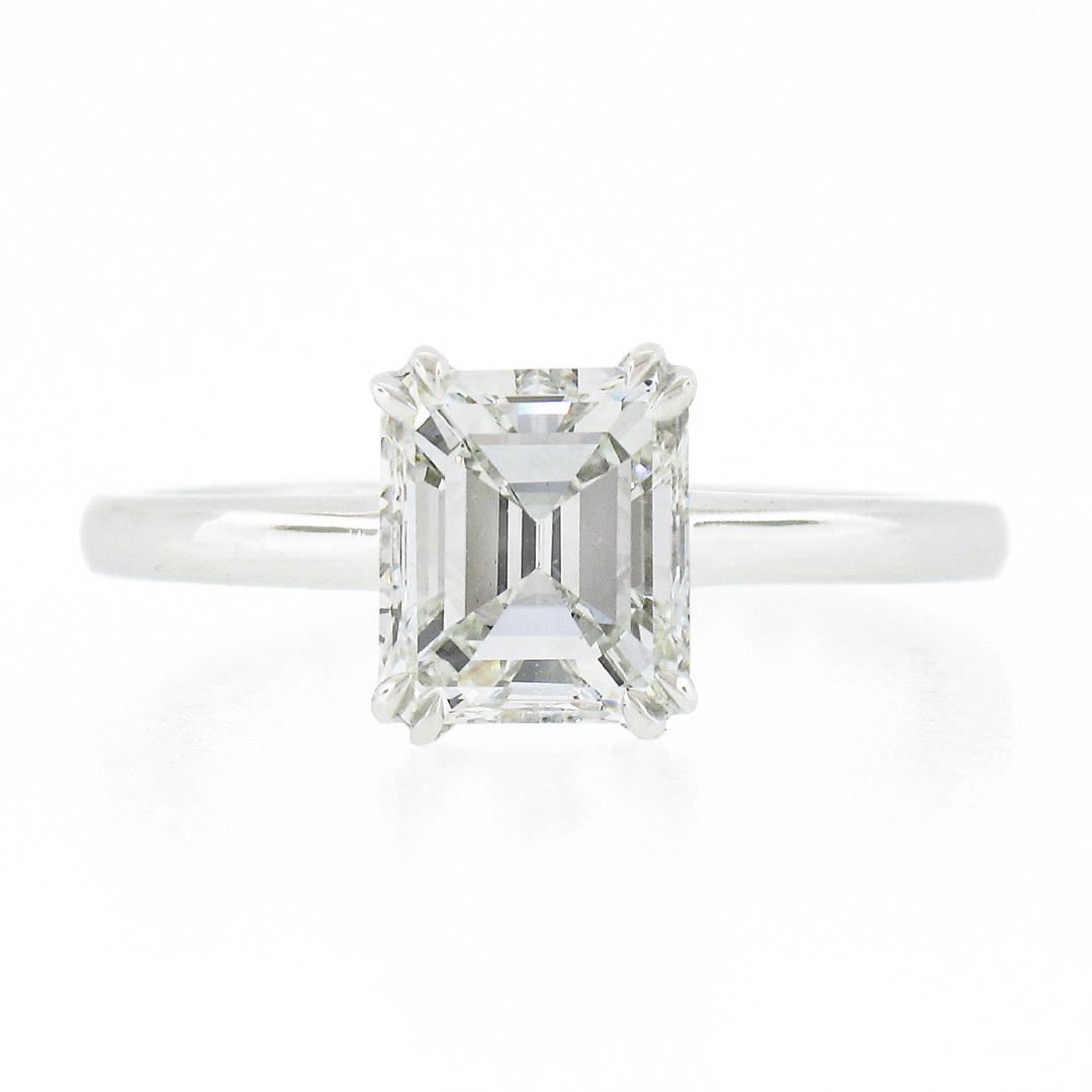 A new platinum engagement ring, with 1 GIA graded emerald cut natural diamonds (F - VS2 ; 1.88ct ). The ring is size 7.0, weighs a total of 4.95 grams, and measures 8.5mm wide. Comes with all original relevant certifications.