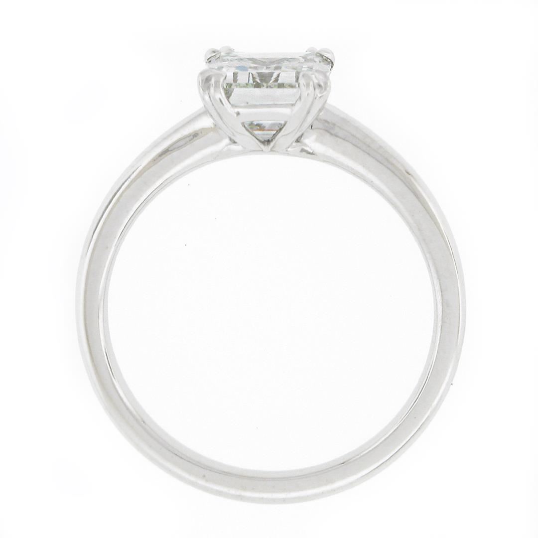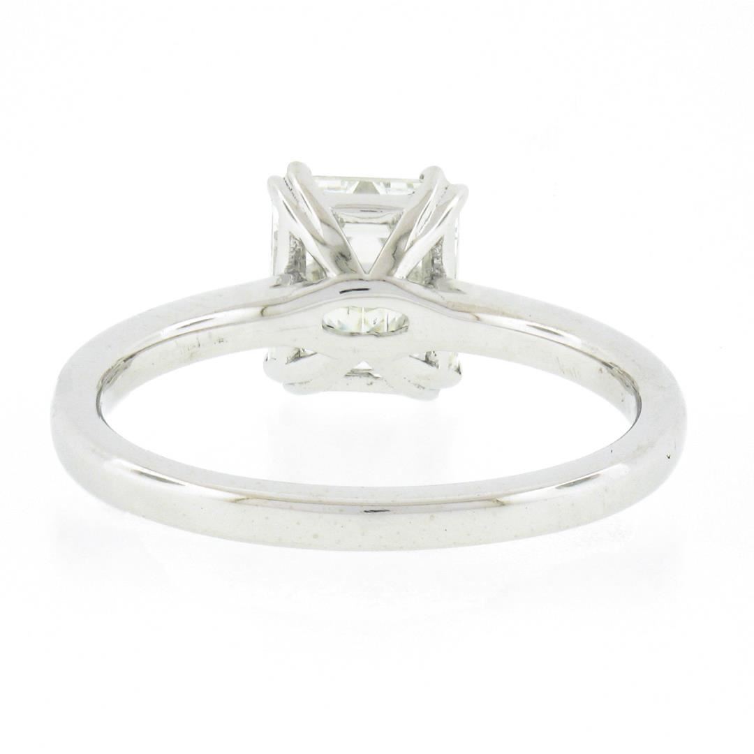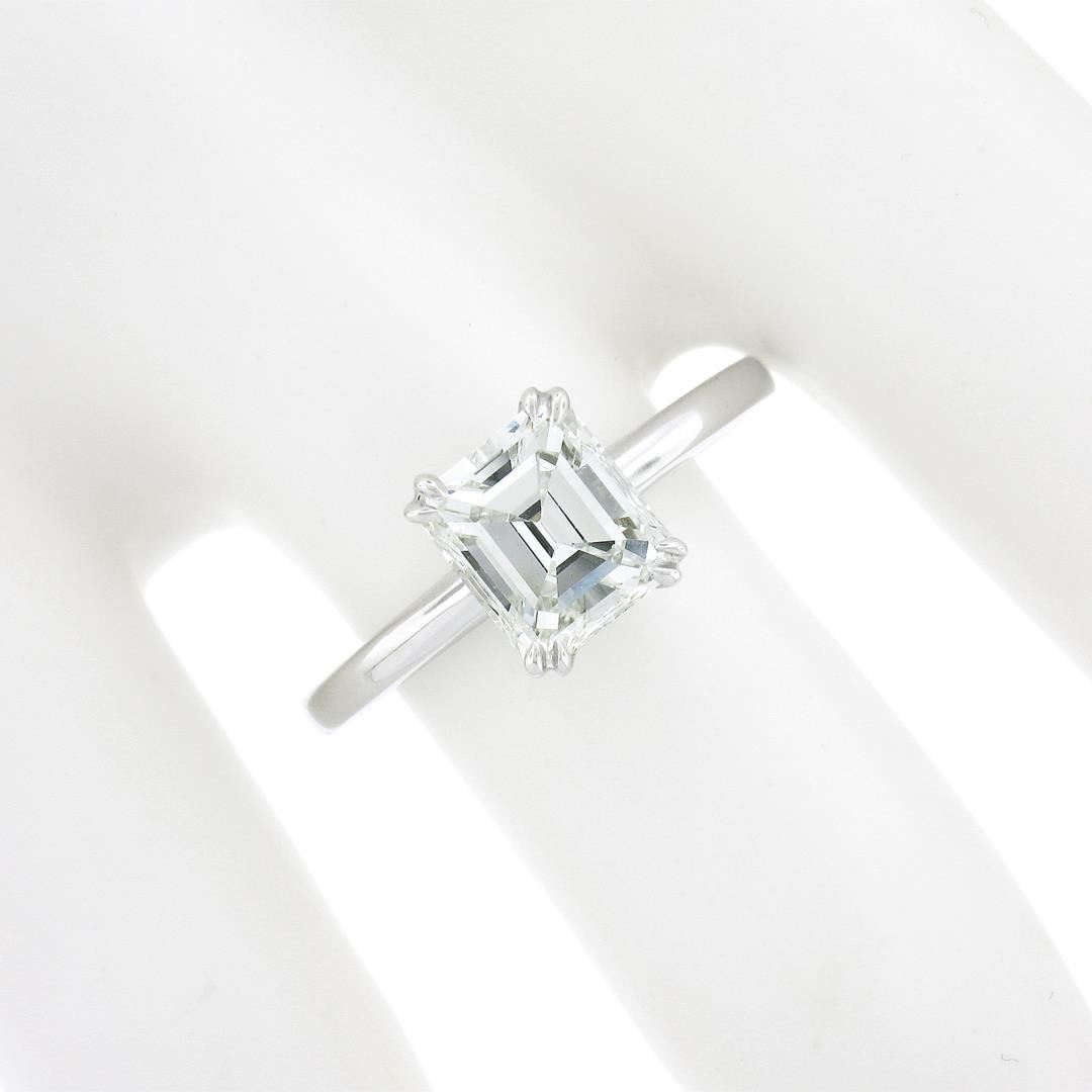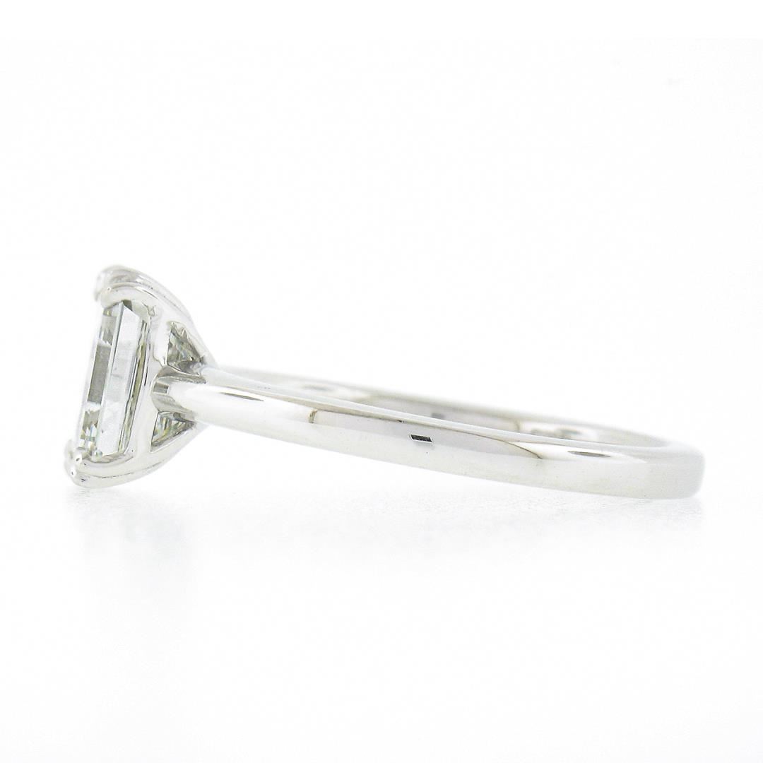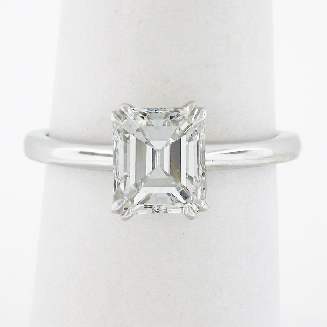 A new platinum engagement ring, with 1 GIA graded emerald cut natural diamonds (F - VS2 ; 1.88ct ). The ring is size 7.0, weighs a total of 4.95 grams, and measures 8.5mm wide. Comes with all original relevant certifications.