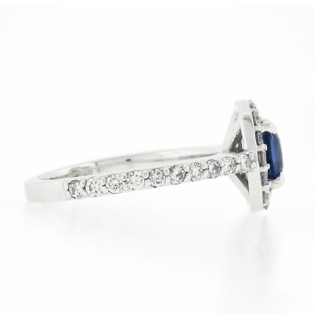 A new solid platinum ring, with 1 GIA graded cushion cut natural sapphire (NO HEAT - 1.15ct), surrounded with a halo of 36 round brilliant cut natural diamonds (F/G - VS1/VS2 ; 0.74ctw). The ring is size 6.5, weighs a total of 6.88 grams, and measures 10.75mm wide. Comes with all original relevant certifications.
