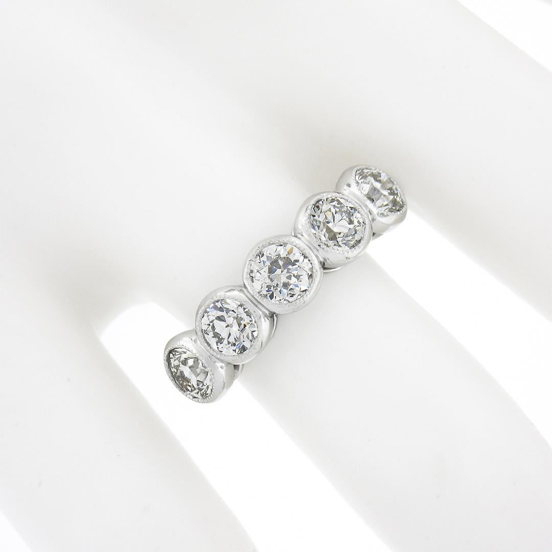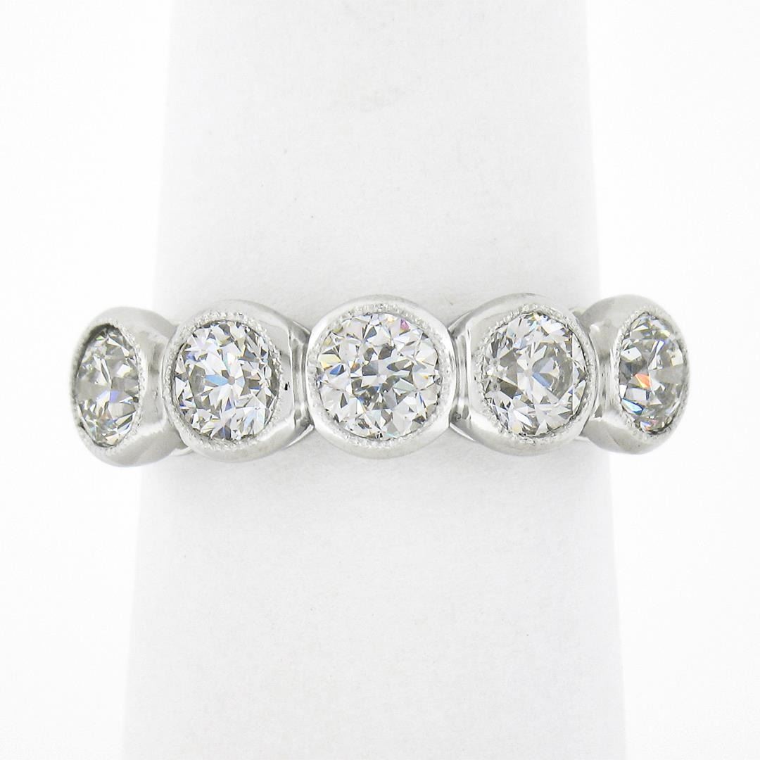 A new platinum band ring, with 5 old european cut natural diamonds (G/H - VS1/VS2 & (1) SI1 ; 1.97ctw). The ring is size 6.5, weighs a total of 6.73 grams, and measures 5.8mm wide.