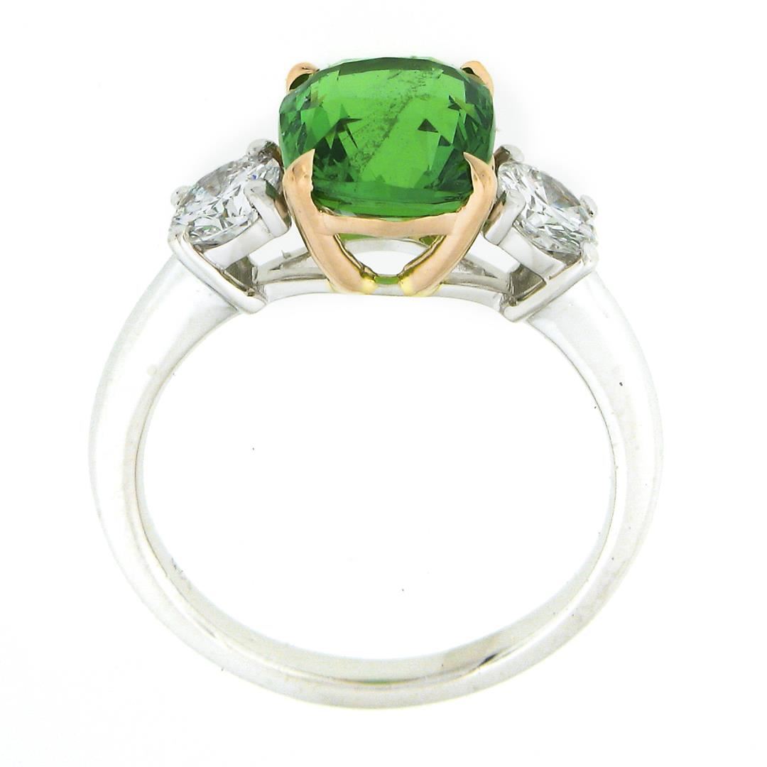 A new solid platinum & 14k yellow gold ring. with 1 GIA graded cushion cut natural tsavorite (3.57ct), and 2 round brilliant cut natural diamonds (F/G - VS1/VS2 ; 0.66ctw). The ring is size 6.5, weighs a total of 5.89 grams, and measures 9.16mm wide. Comes with all original relevant certifications.