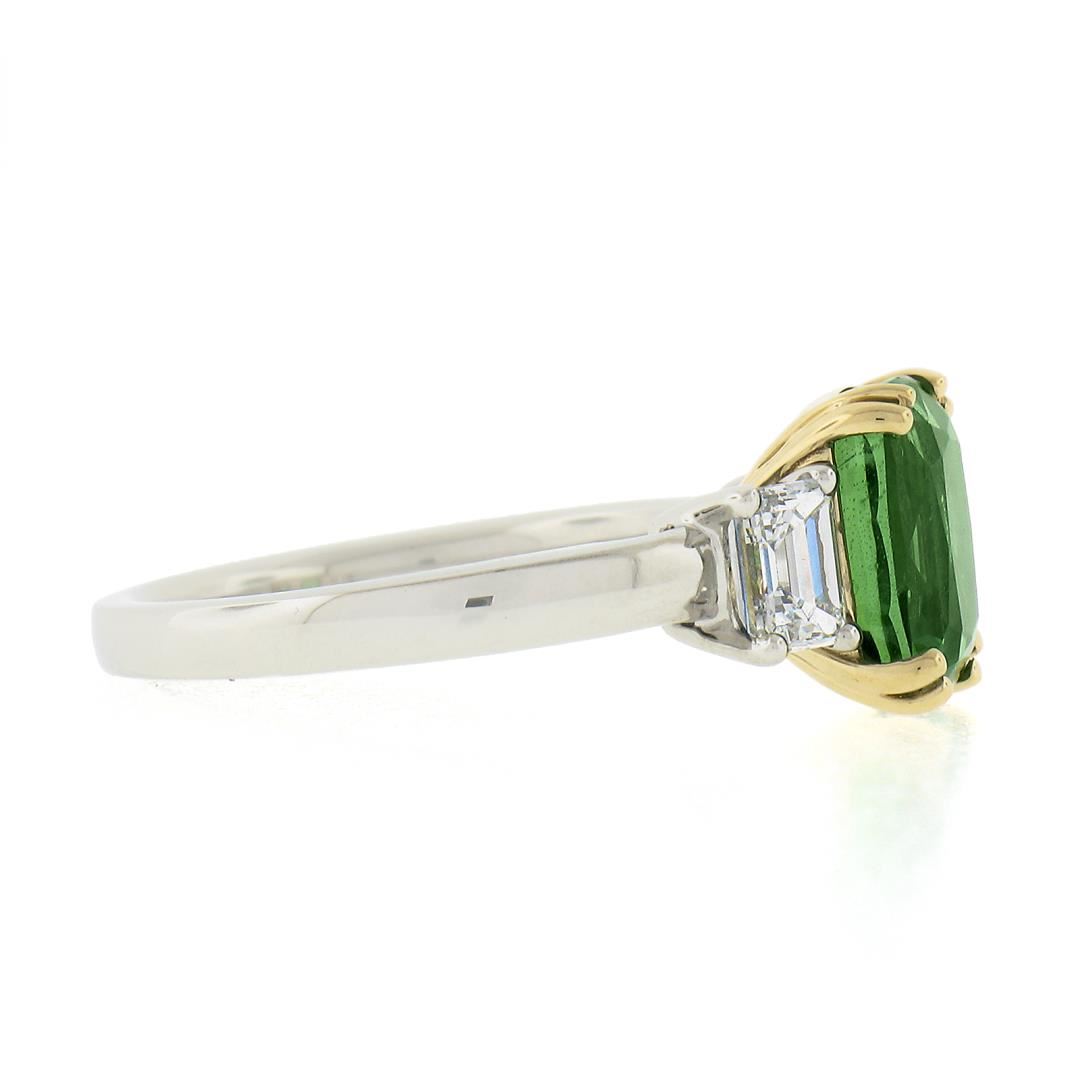 A solid new platinum & 14k yellow gold ring, featuring 1 GIA graded cushion cut natural tsavorite (3.67ct), and 2 emerald cut natural diamonds (E/F - VVS2/VS1 ; 0.72ctw). The ring is size 6.5, weighs a total of 6.40 grams, and measures 9.5mm wide. Comes with all original relevant certifications.