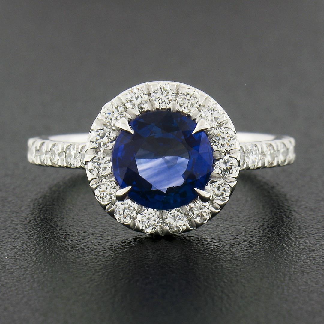 A new solid platinum ring, with 1 GIA graded round cut natural sapphire (1.41ct ), and a halo of 39 round cut natural diamonds (G/H - VS1/VS2 ; 0.80ctw). The ring is size 6.5, weighs a total of 4.19 grams, and measures 11.1mm wide. Comes with all original relevant certifications.