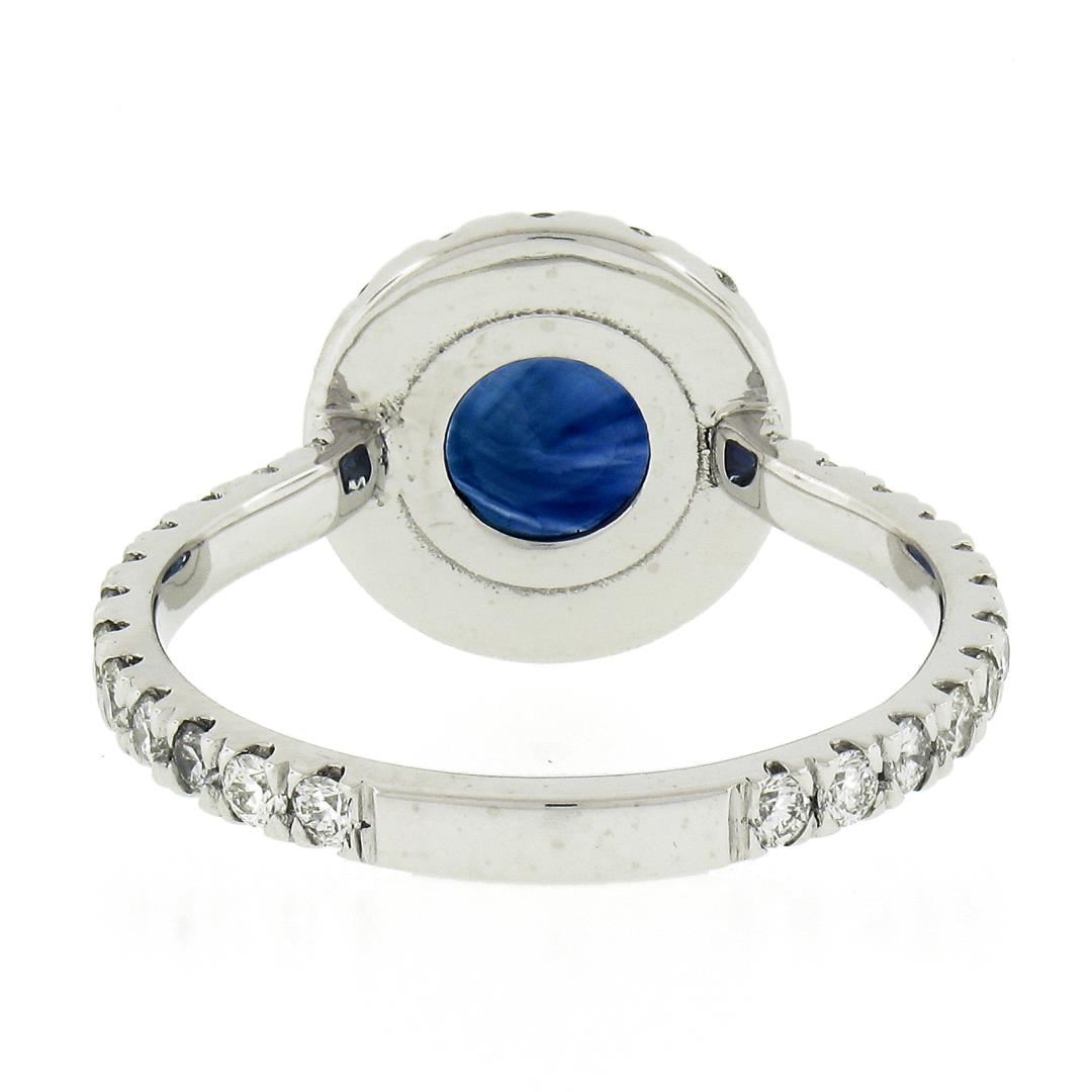 A new solid platinum ring, with 1 GIA graded round cut natural sapphire (1.41ct ), and a halo of 39 round cut natural diamonds (G/H - VS1/VS2 ; 0.80ctw). The ring is size 6.5, weighs a total of 4.19 grams, and measures 11.1mm wide. Comes with all original relevant certifications.