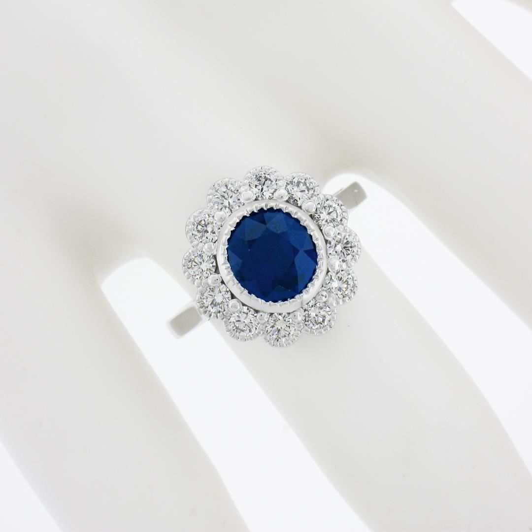 A new solid platinum ring, with 1 GIA graded oval cut natural sapphire (1.58ct), and a halo of 12 round brilliant cut natural diamonds (F/G - VS1/VS2 ;' 0.79). The ring is size 6.5, weighs a total of 7.89 grams, and measures 14.70mm wide. Comes with all original relevant certifications.