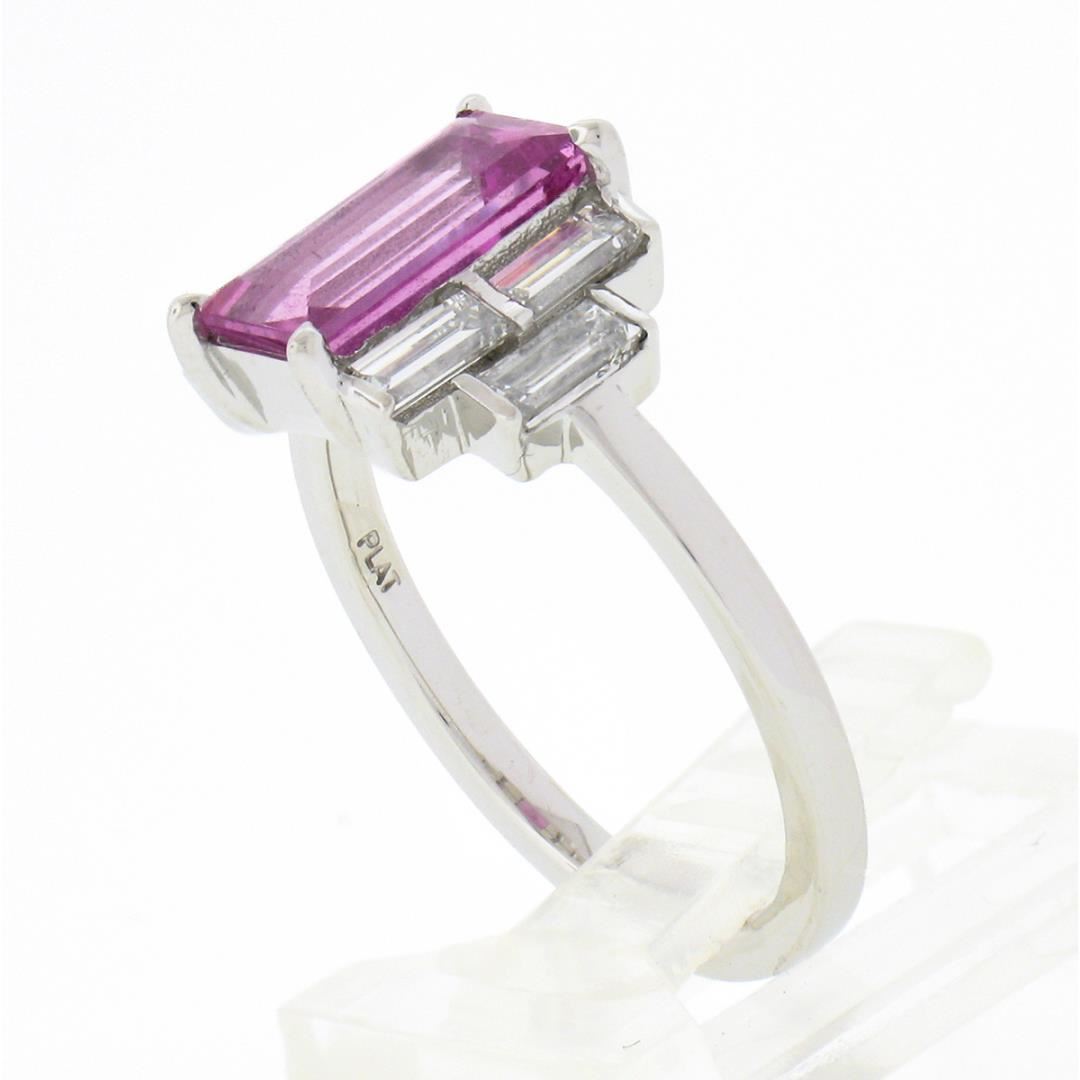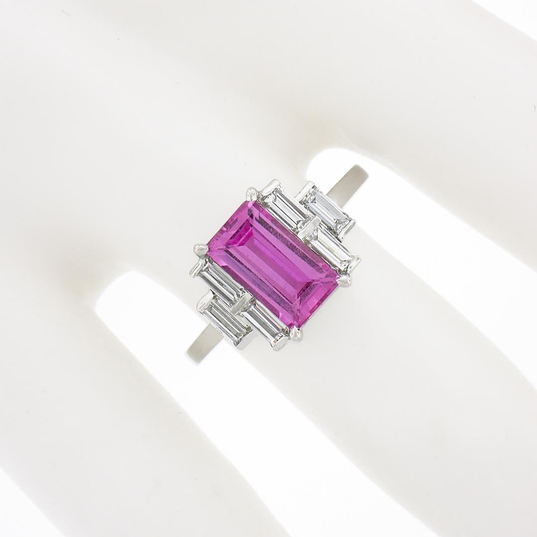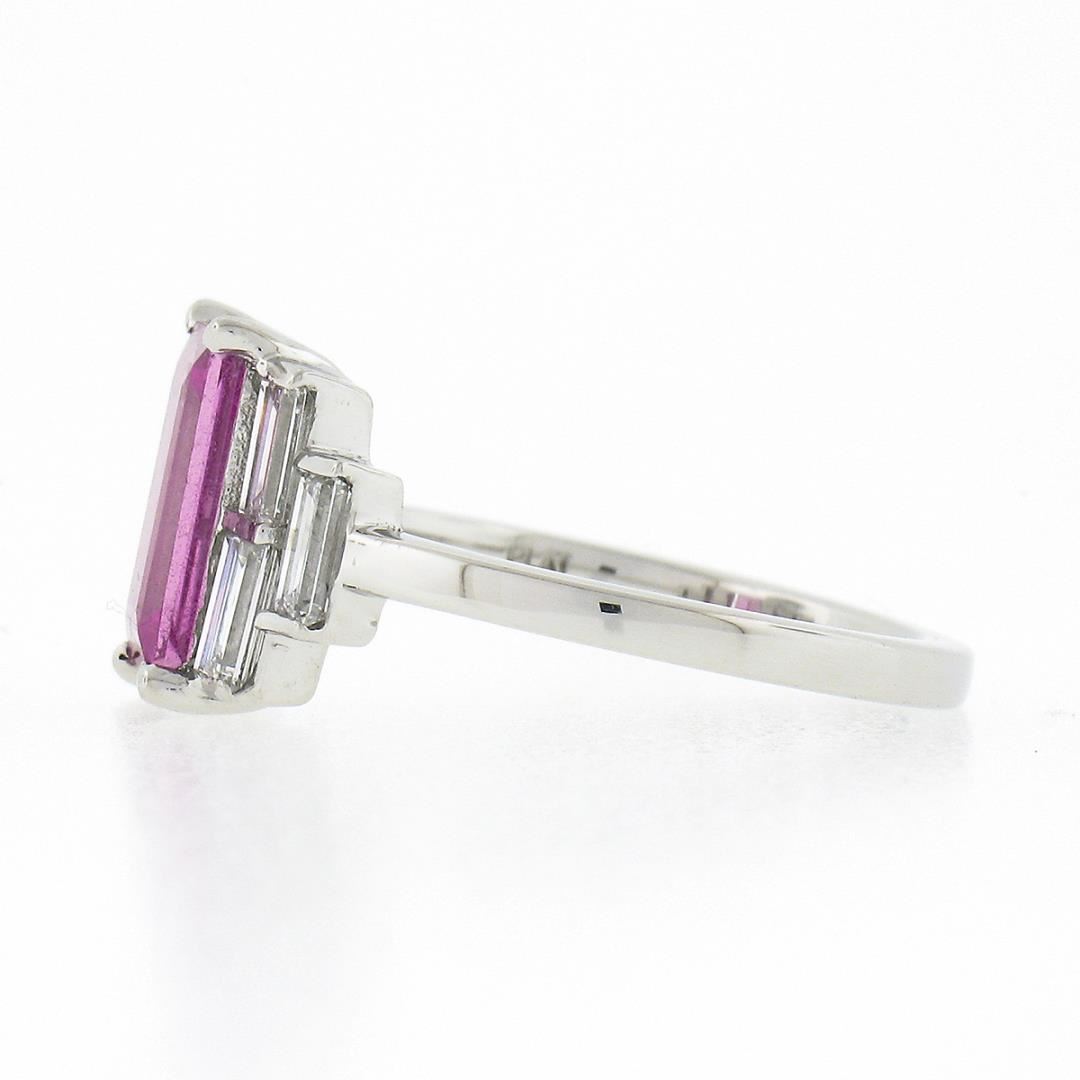 A new solid platinum engagement ring, with 1 GIA graded emerald cut pink sapphire (2.00ct ), and 6 straight baguette cut natural diamonds (G/H - VS1/VS2 ; 0.76ctw). The ring is size ##, weighs a total of ## grams, and measures ##mm wide. Comes with all original relevant certifications.