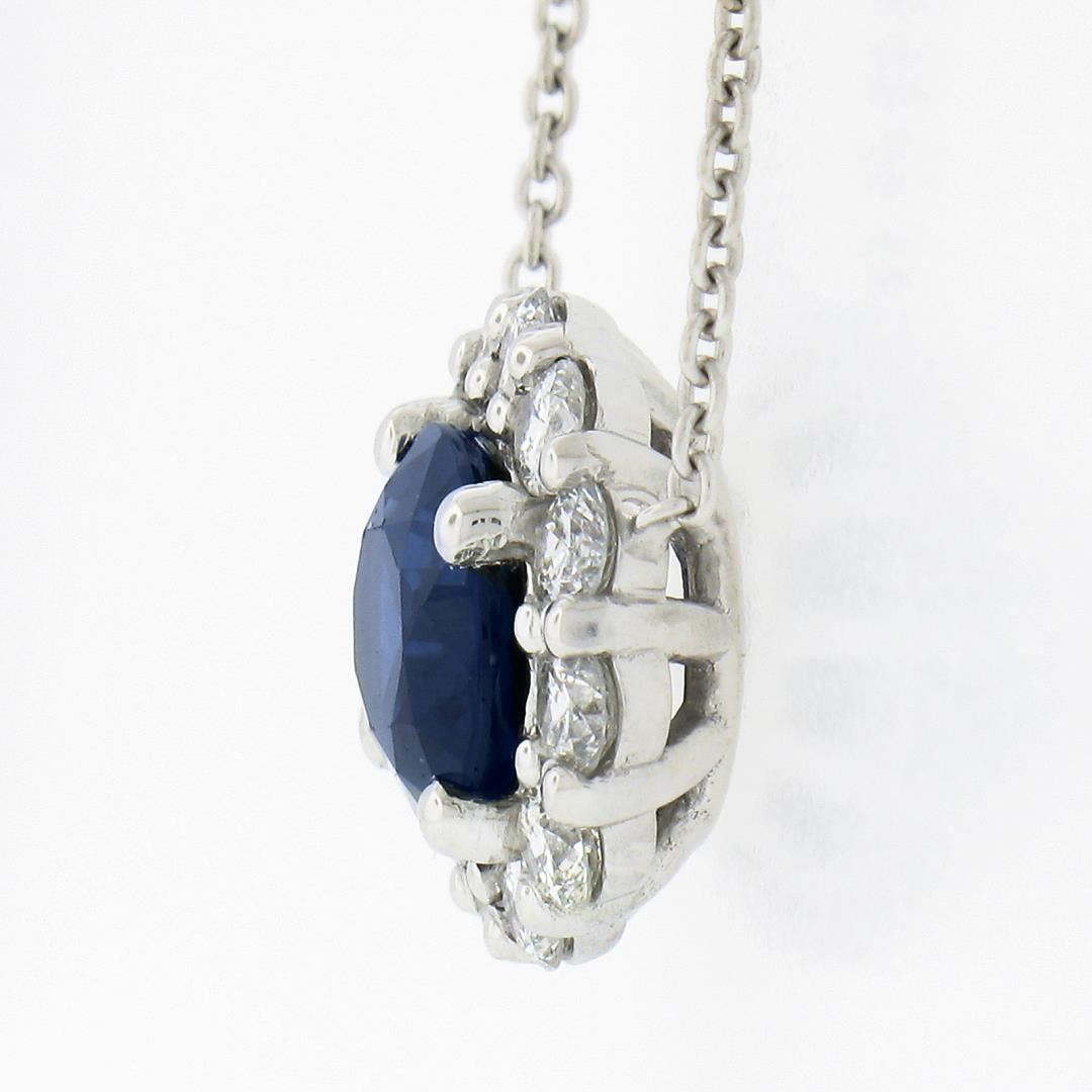 A new solid platinum pendant necklace, featuring 1 GIA graded oval cut natural sapphire (2.14ct ), surround with a halo of 12 round cut natural diamonds (G/H - VS1/VS2 ; 0.63ctw). Adjustable 16.5 and 18.5 inch cable link chain, 6.52 grams total weight, pendant measures 12.2x13.1mm. Comes with all original relevant certifications.