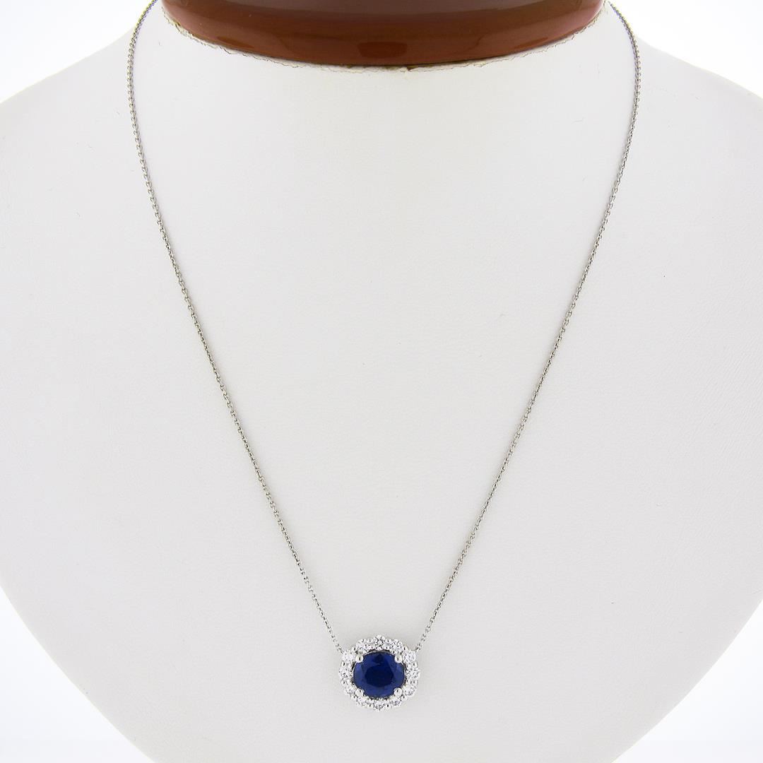 A new solid platinum pendant necklace, featuring 1 GIA graded oval cut natural sapphire (2.14ct ), surround with a halo of 12 round cut natural diamonds (G/H - VS1/VS2 ; 0.63ctw). Adjustable 16.5 and 18.5 inch cable link chain, 6.52 grams total weight, pendant measures 12.2x13.1mm. Comes with all original relevant certifications.