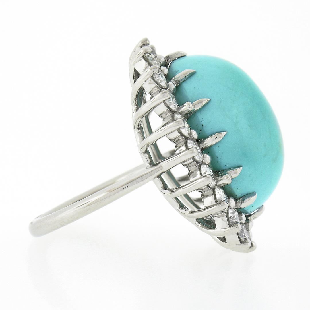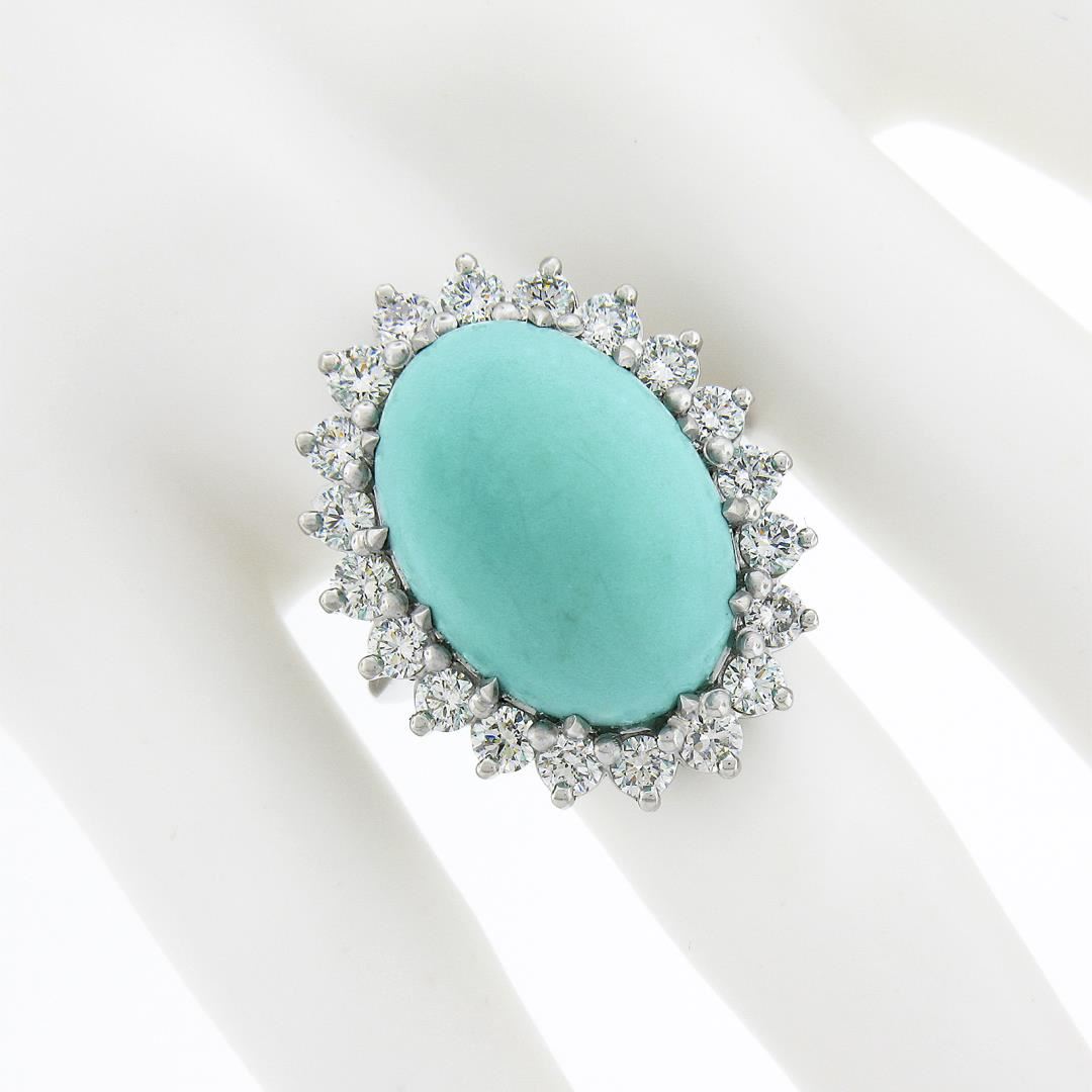 A new solid platinum cocktail ring, featuring 1 oval cabochon cut natural turquoise (20.3x14.5mm), surrounded with a halo of 20 round brilliant cut natural diamonds (G/H - VS1/VS2 - 2.06ctw). The ring is size 6.5, weighs a total of 18.91 grams, and measures 28.4mm wide.
