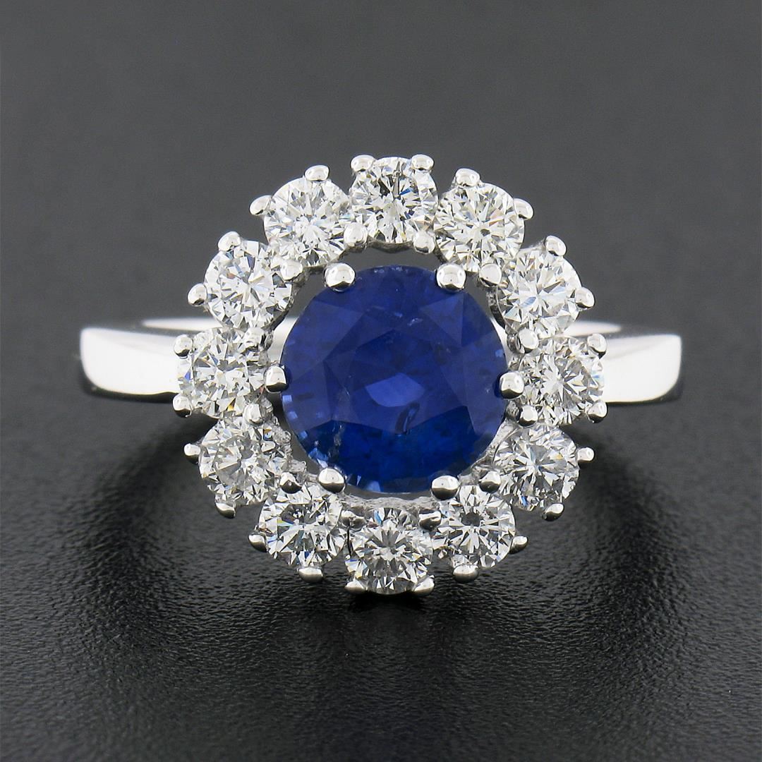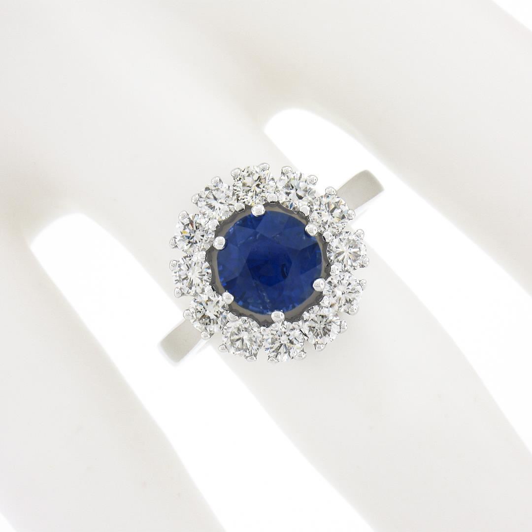 A new solid platinum ring, with 1 GIA graded round cut natural sapphire (1.96ct), surrounded with a halo of 12 round brilliant cut natural diamonds (G/H - VS2/SI1 ; 1.10ctw). The ring is size 6.0, weighs a total of 9.51 grams, and measures 14.6mm wide. Comes with all original relevant certifications.
