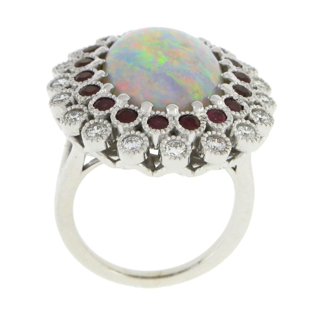 A new solid platinum cocktail ring, with 1 GIA graded oval cabochon cut natural opal (6.35ct ), 18 round cut natural diamonds (F/G - VS1/VS2 w/ a Few SI1 ; 0.81ctw), and 18 round cut natural rubies (1.04ctw). The ring is size 6.5, weighs a total of 15.74 grams, and measures 27.70mm wide. Comes with all original relevant certifications.