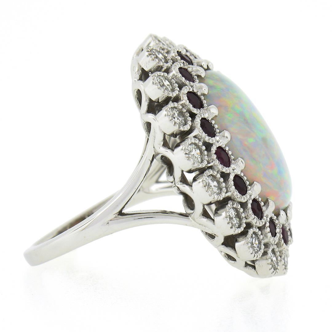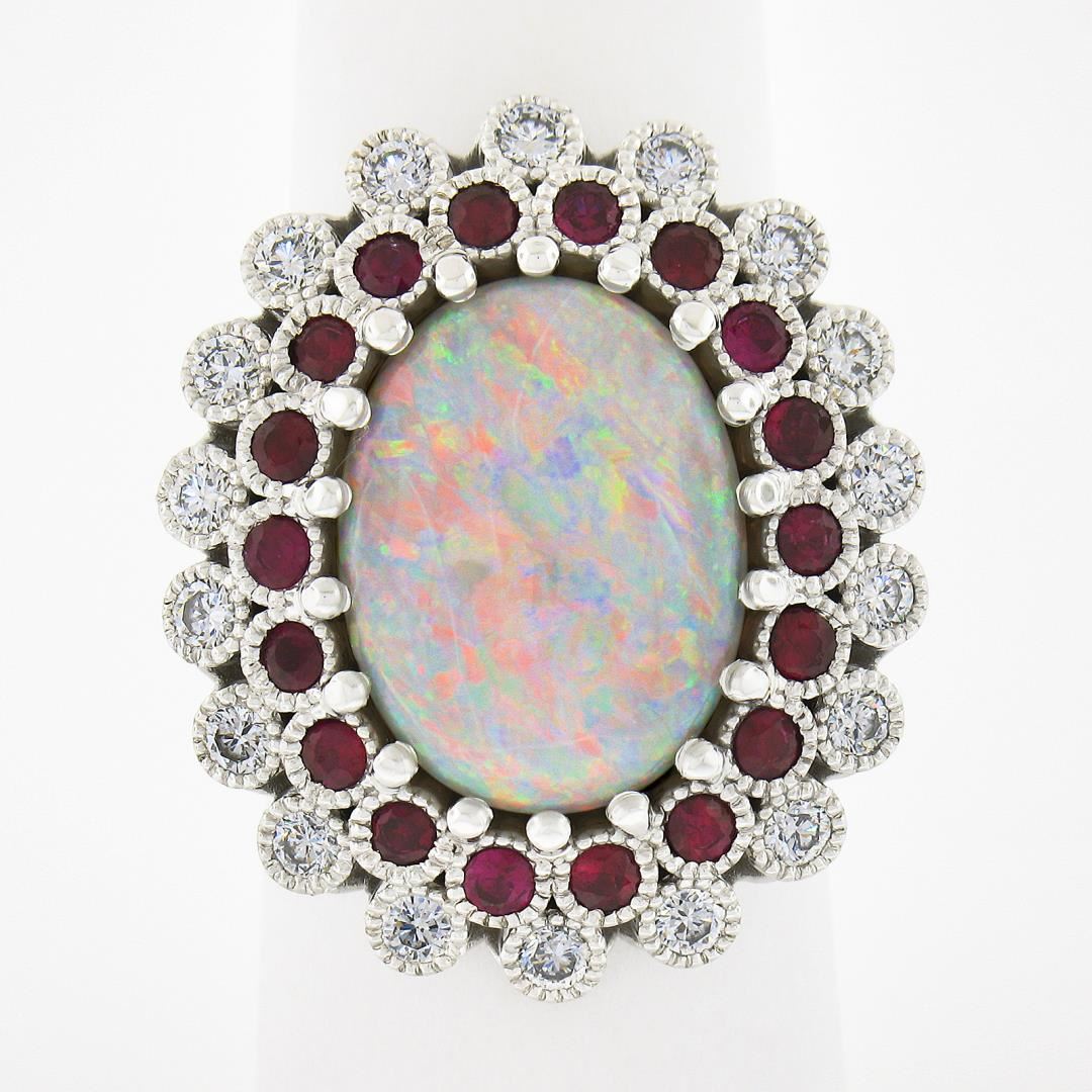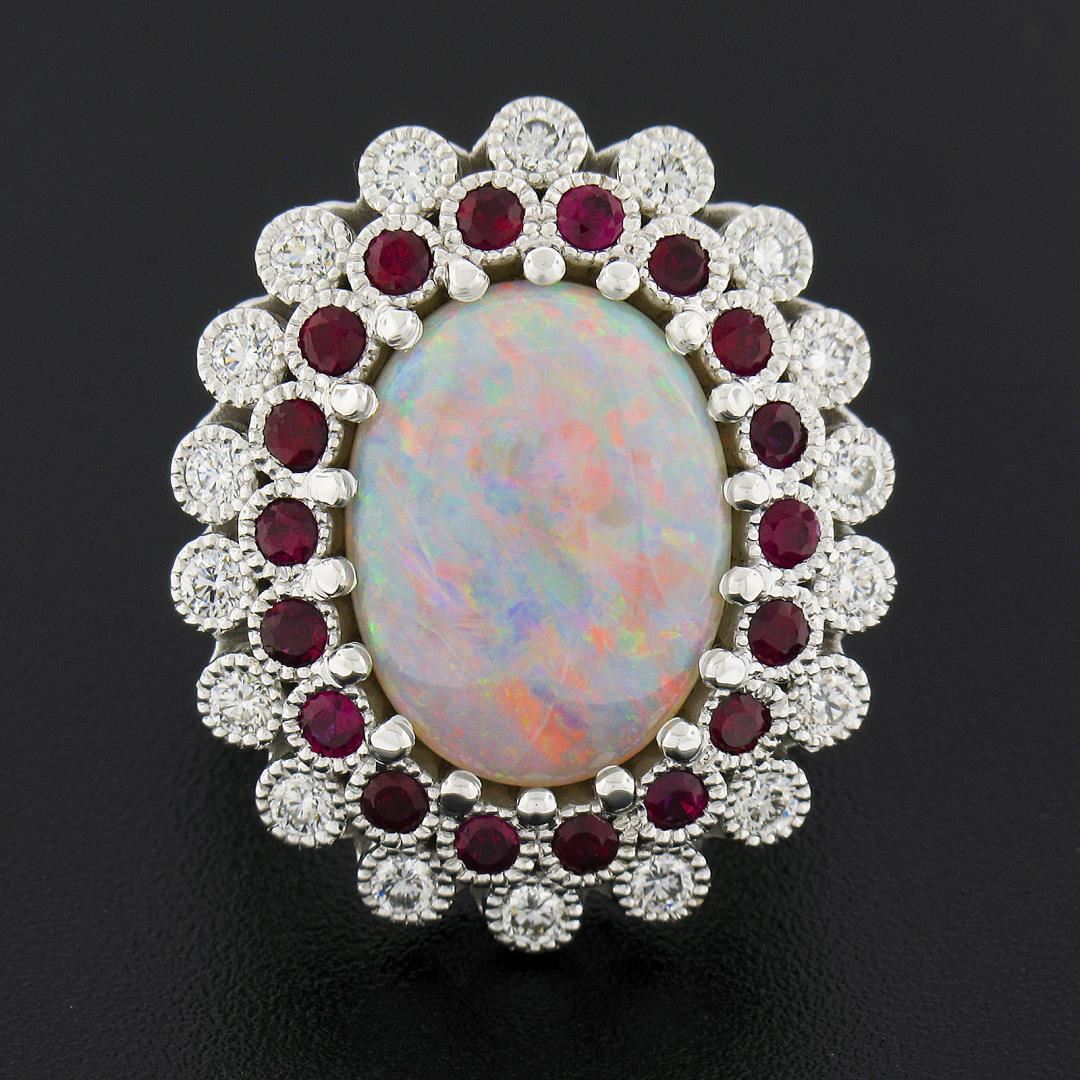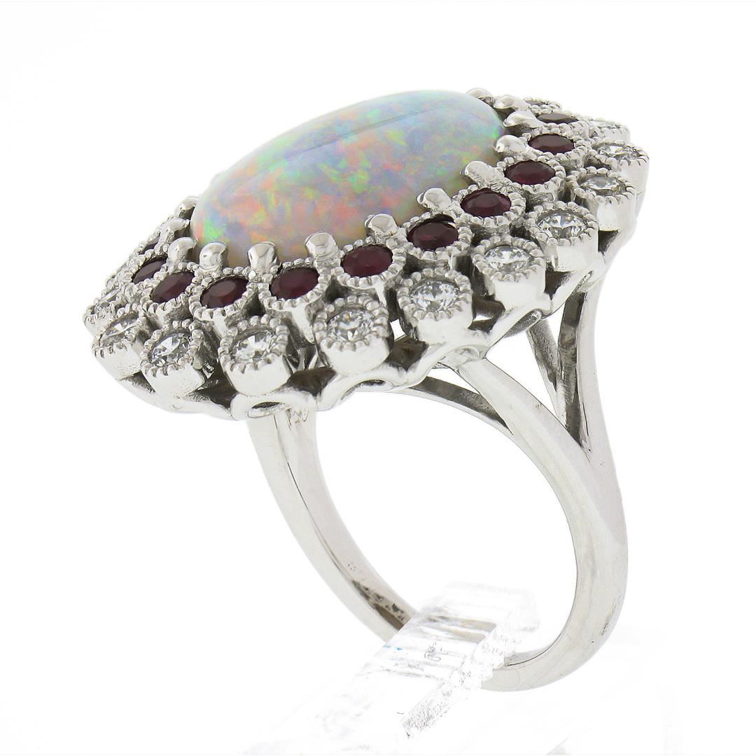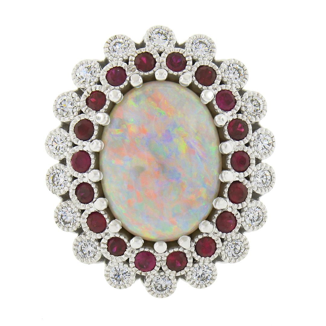 A new solid platinum cocktail ring, with 1 GIA graded oval cabochon cut natural opal (6.35ct ), 18 round cut natural diamonds (F/G - VS1/VS2 w/ a Few SI1 ; 0.81ctw), and 18 round cut natural rubies (1.04ctw). The ring is size 6.5, weighs a total of 15.74 grams, and measures 27.70mm wide. Comes with all original relevant certifications.