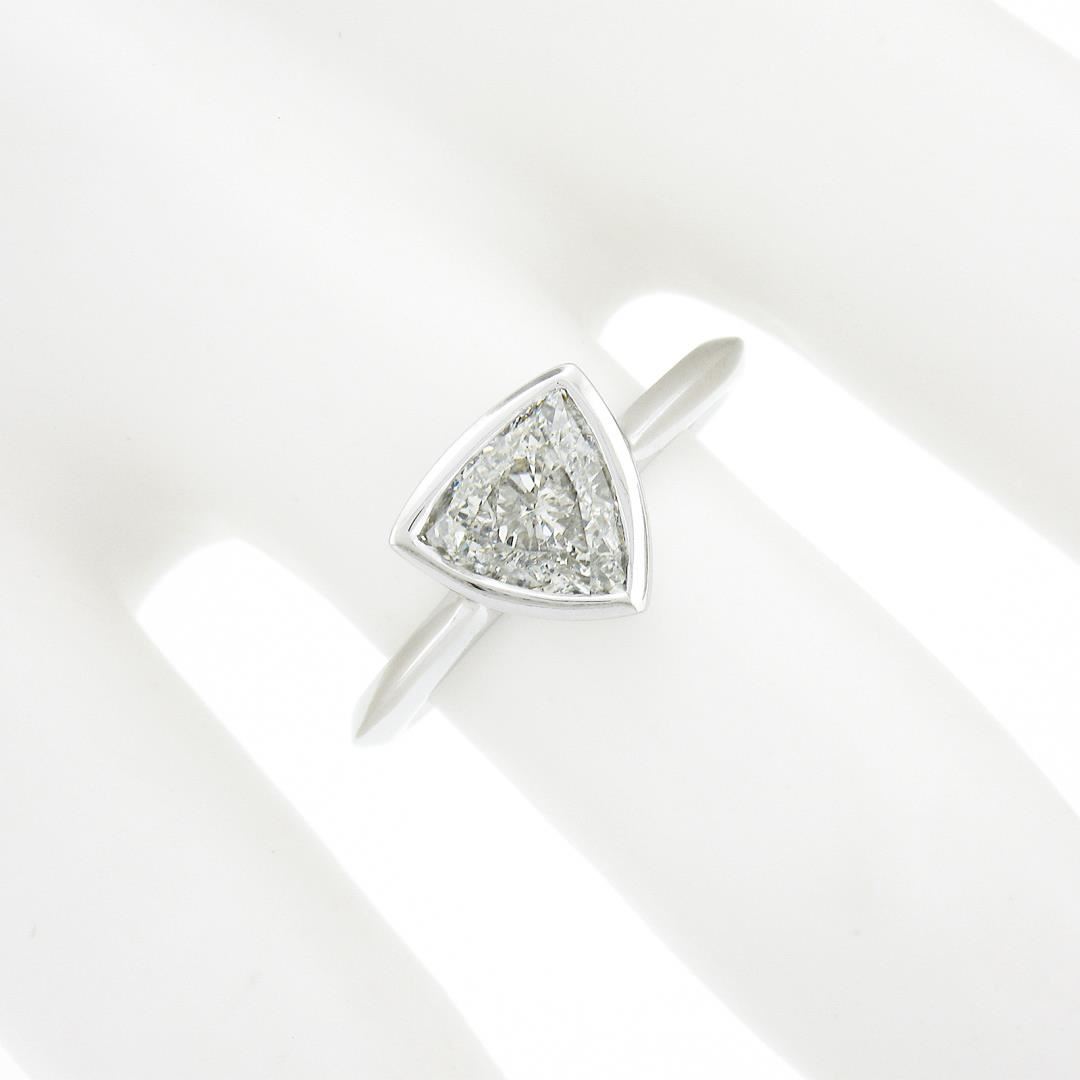 A new solid platinum solitaire ring, with 1 GIA graded trillion cut natural diamond (G - SI2 ; 1.01ct). The ring is size 6.0, weighs a total of 5.0 grams, and measures 8.90mm wide. Comes with all original relevant certifications.