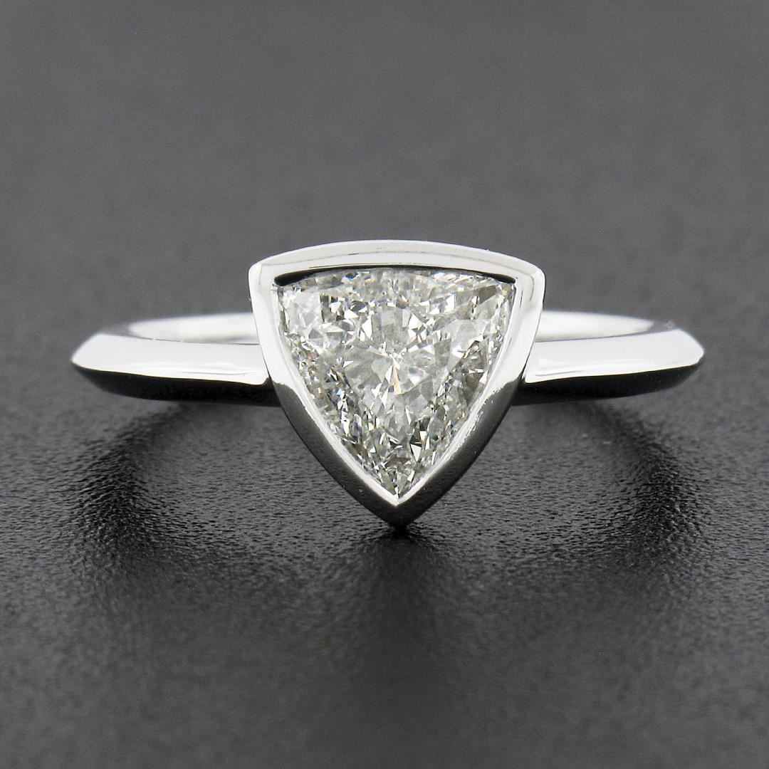 A new solid platinum solitaire ring, with 1 GIA graded trillion cut natural diamond (G - SI2 ; 1.01ct). The ring is size 6.0, weighs a total of 5.0 grams, and measures 8.90mm wide. Comes with all original relevant certifications.