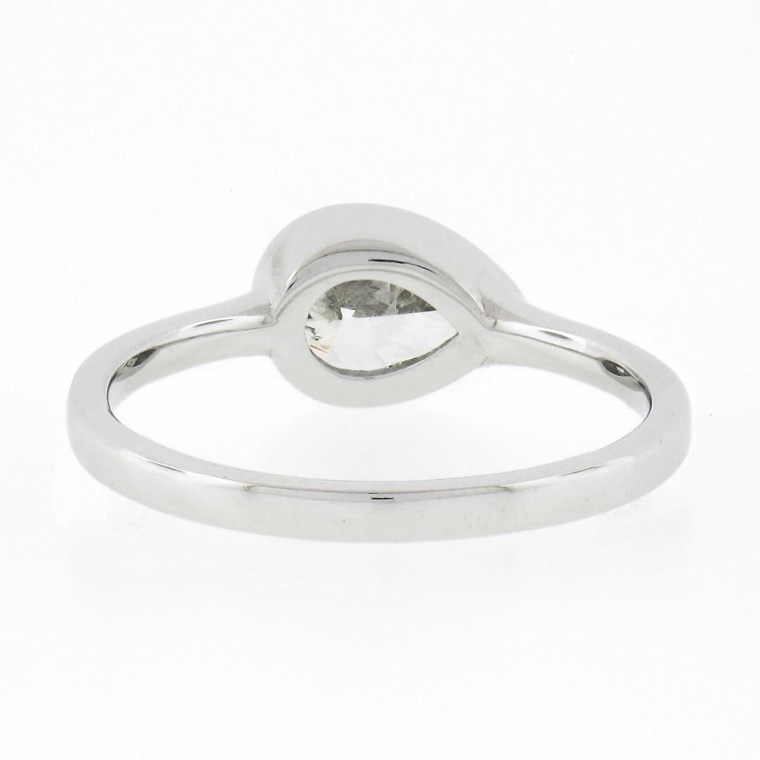 A new platinum sideways solitaire ring, with 1 GIA graded pear cut natural diamond (J - SI2 ; 1.06ct). The ring is size 6.5, weighs a total of 3.87 grams, and measures 6.75mm wide. Comes with all original relevant certifications.