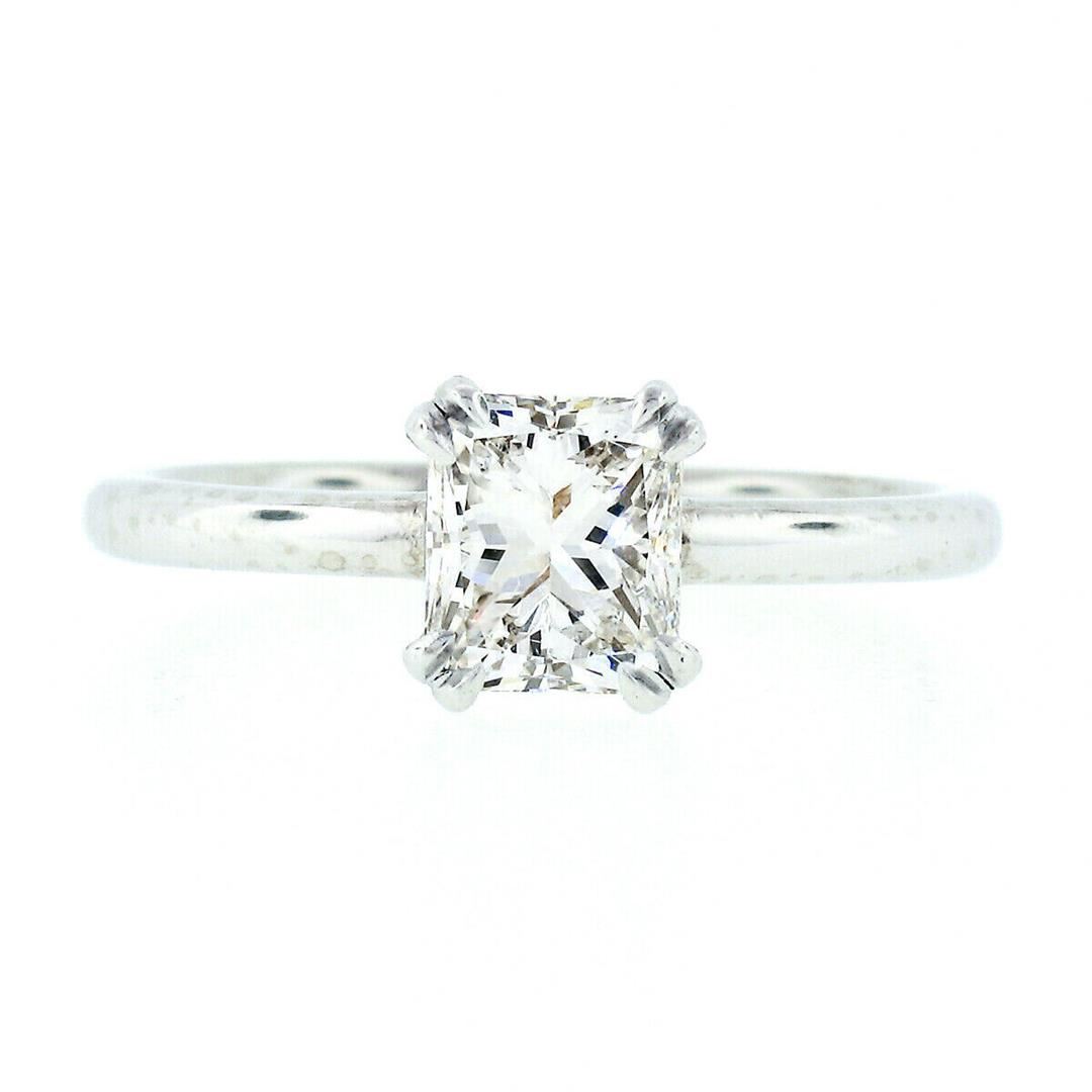 A new solid platinum solitaire ring, with 1 Gia certified rectangular brilliant natural diamond (H - VS2 ; 1.11 ct). The ring is size 6.5, weighs a total of 4.16 grams, and measures 7mm wide. Comes with all original relevant certifications.
