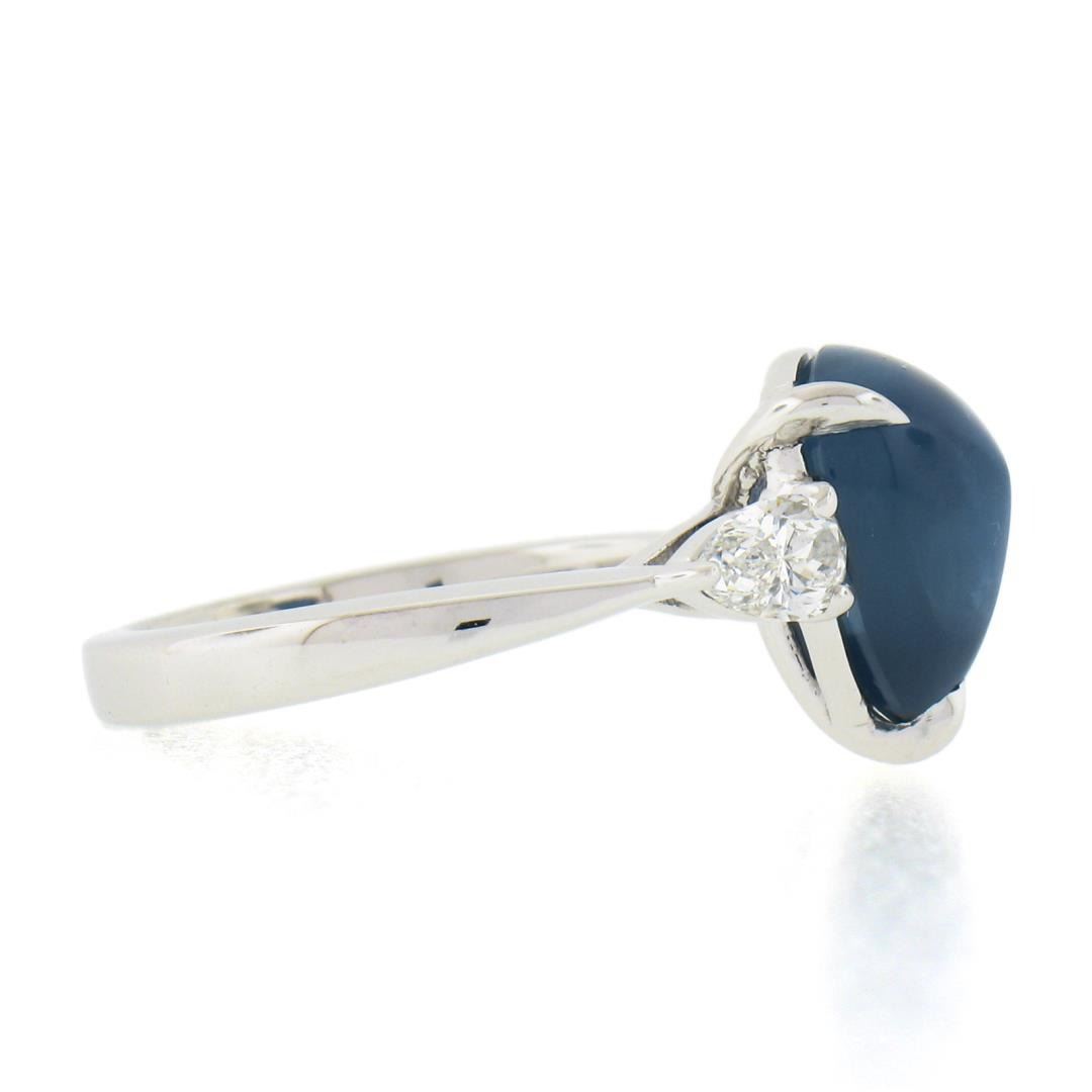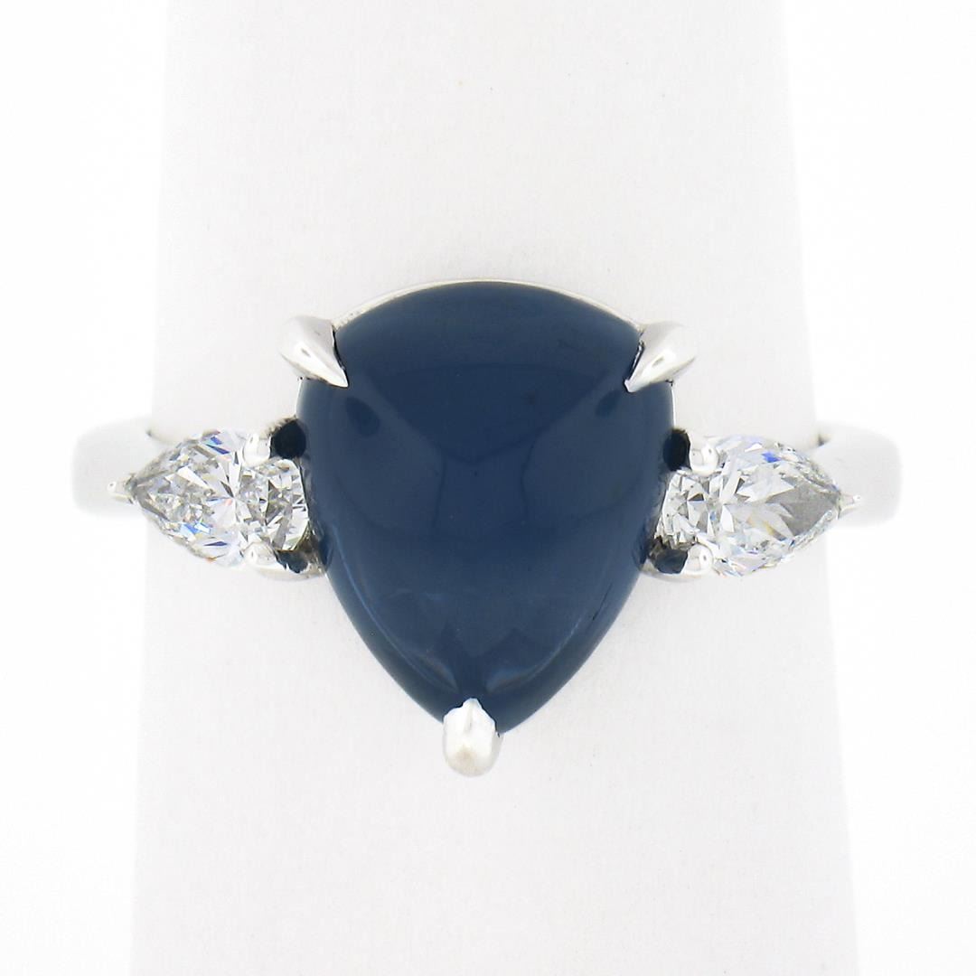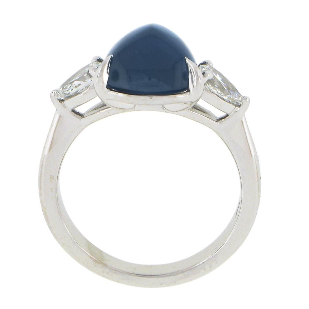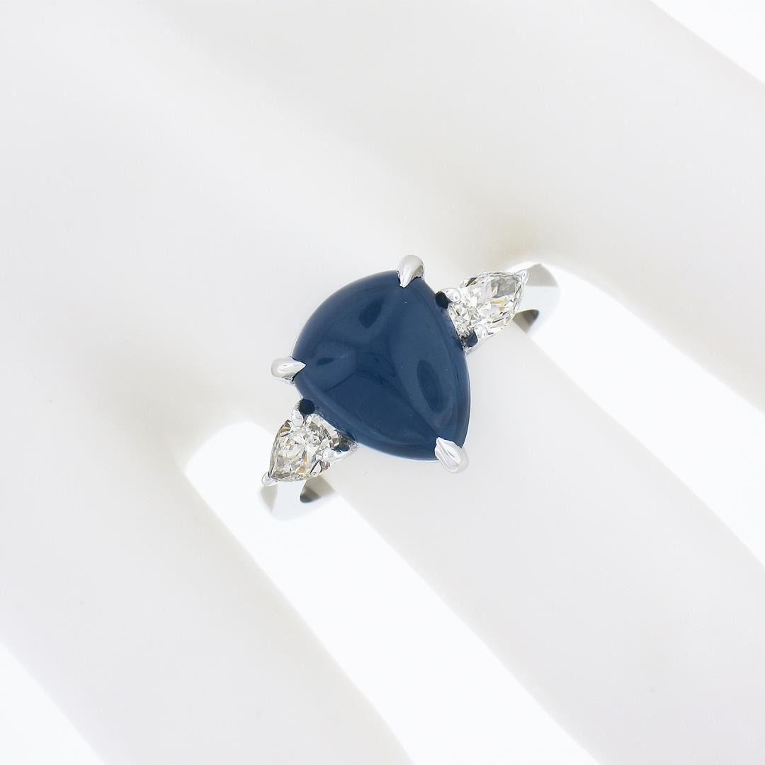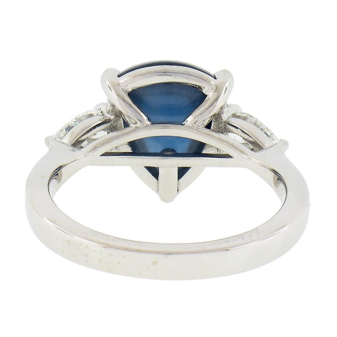 A new platinum ring, with 1 GUBELIN graded triangle cabochon cut natural sapphire (5.11ct), and 2 pear cut natural diamonds (G/H - VS1/VS2 ; 0.52ctw). The ring is size 6.5, weighs a total of 6.58 grams, and measures 11.8mm wide. Comes with all original relevant certifications.