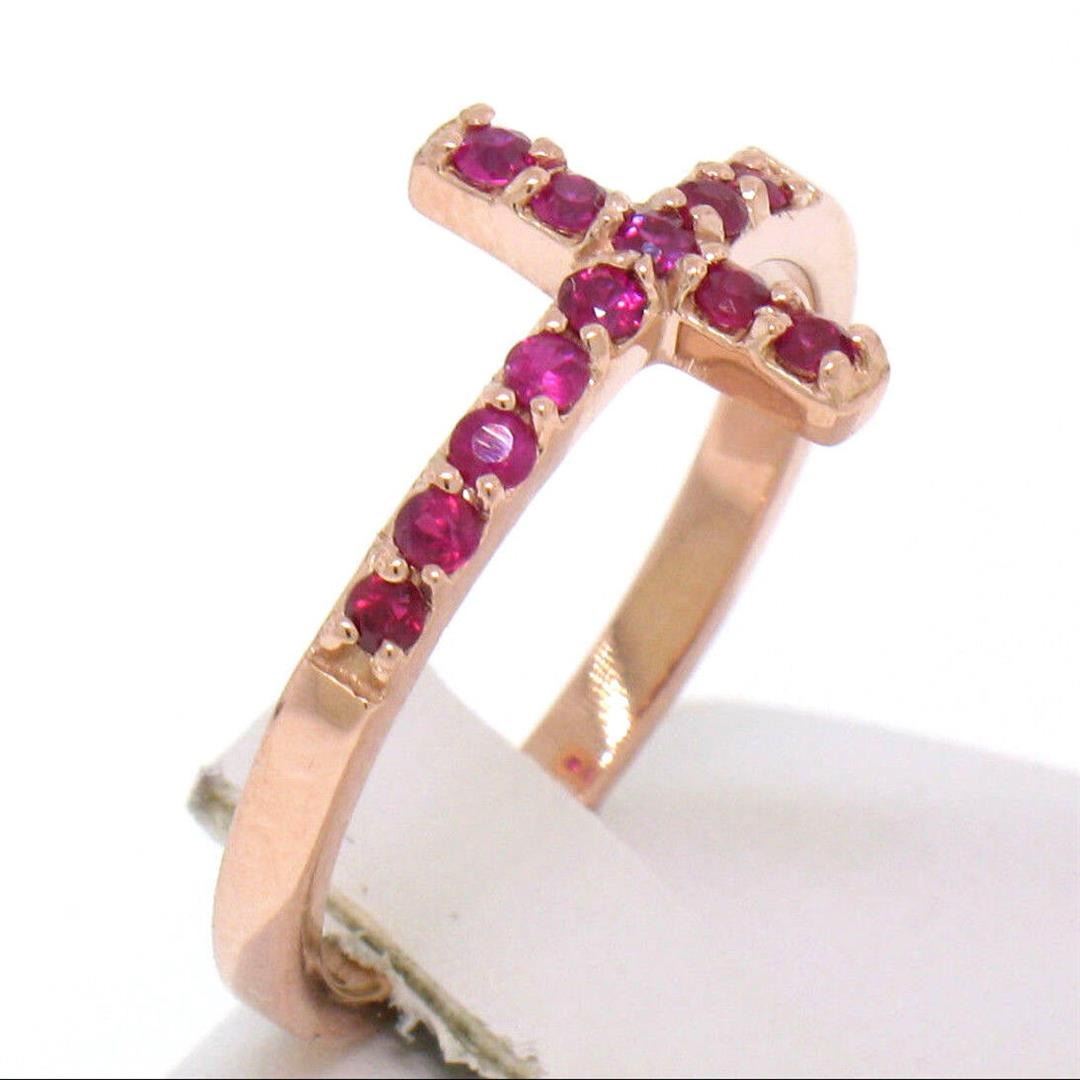 A new solid 14k rose gold cross band ring, with 12 round brilliant cut natural rubies (0.25ctw). The ring is size 6.0, weighs a total of 2.3 grams, and measures 11.0mm wide.