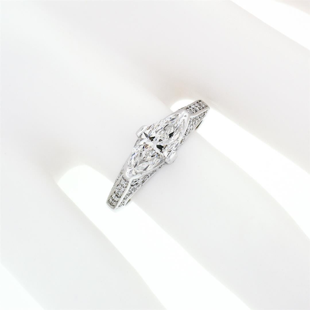 A new solid 18k white gold solitaire engagement ring, featuring 1 Gia certified marquise cut natural diamond (E - VS2 ; 1.15ct ), accented with 60 round brilliant cut natural diamonds (E/F - VS1/VS2 ; 0.35ctw). The ring is size 6.5, weighs a total of 4.57 grams, and measures 6.71mm wide. Comes with all original relevant certifications.