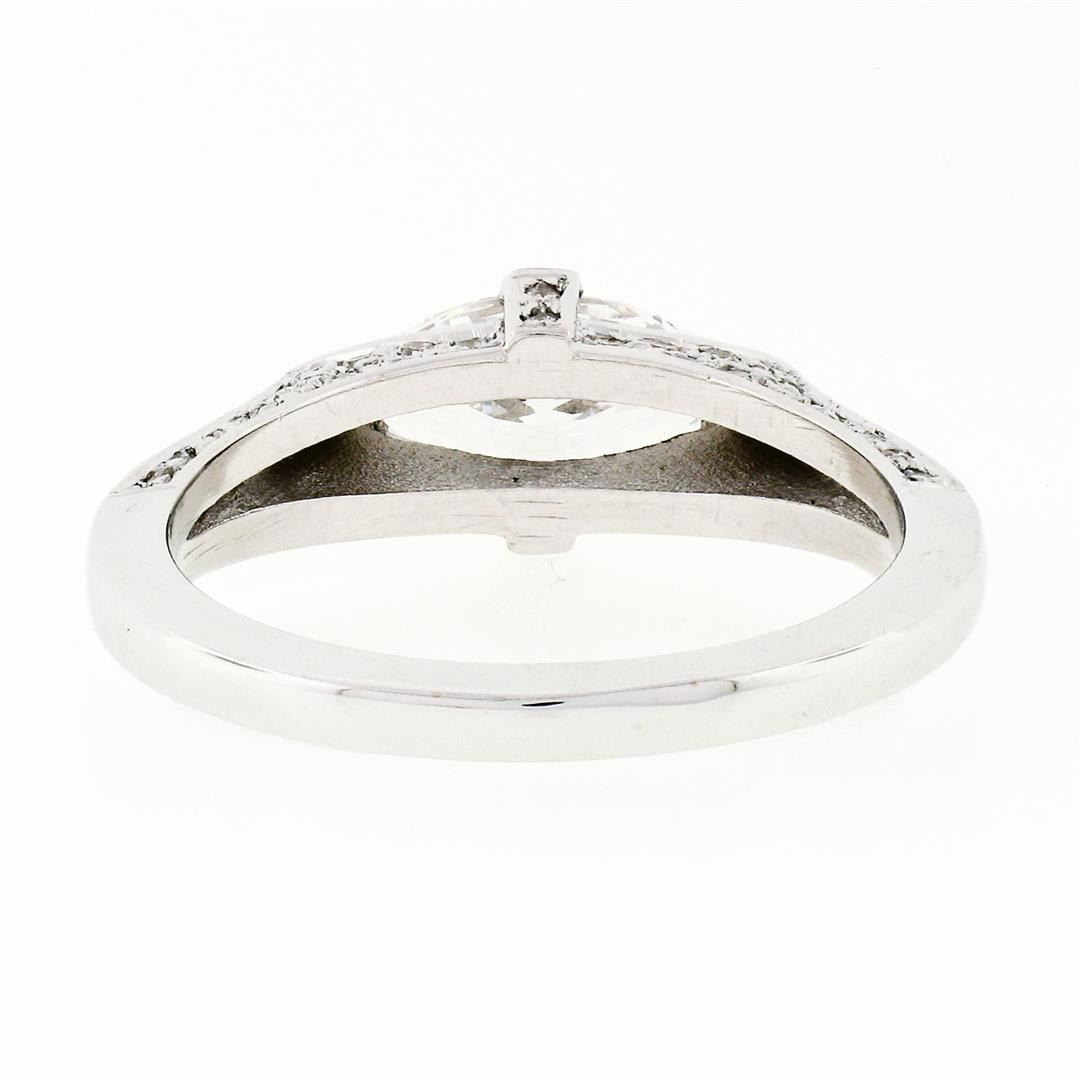 A new solid 18k white gold solitaire engagement ring, featuring 1 Gia certified marquise cut natural diamond (E - VS2 ; 1.15ct ), accented with 60 round brilliant cut natural diamonds (E/F - VS1/VS2 ; 0.35ctw). The ring is size 6.5, weighs a total of 4.57 grams, and measures 6.71mm wide. Comes with all original relevant certifications.