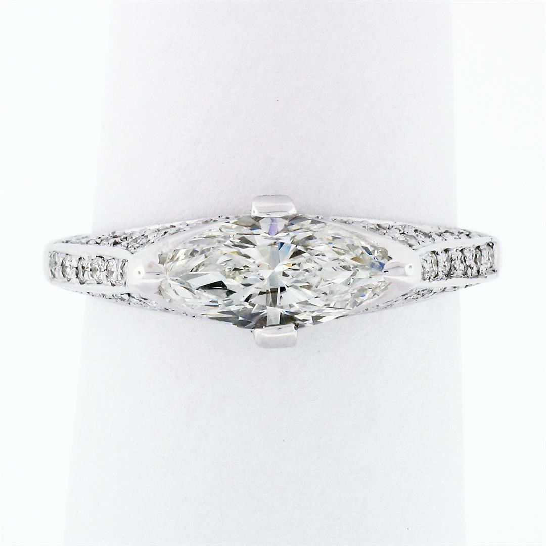 A new solid 18k white gold solitaire engagement ring, featuring 1 Gia certified marquise cut natural diamond (E - VS2 ; 1.15ct ), accented with 60 round brilliant cut natural diamonds (E/F - VS1/VS2 ; 0.35ctw). The ring is size 6.5, weighs a total of 4.57 grams, and measures 6.71mm wide. Comes with all original relevant certifications.