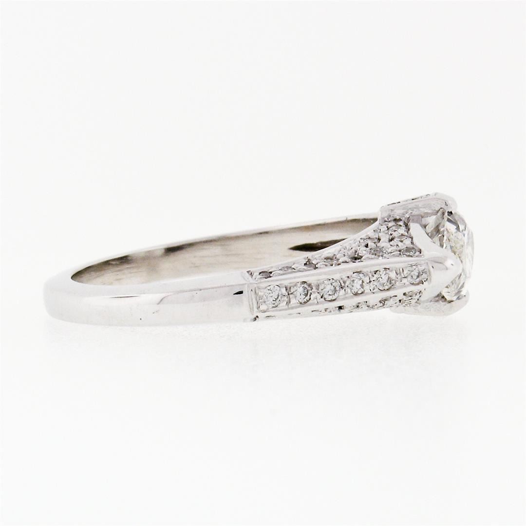 A new solid 18k white gold solitaire engagement ring, featuring 1 Gia certified marquise cut natural diamond (E - VS2 ; 1.15ct ), accented with 60 round brilliant cut natural diamonds (E/F - VS1/VS2 ; 0.35ctw). The ring is size 6.5, weighs a total of 4.57 grams, and measures 6.71mm wide. Comes with all original relevant certifications.