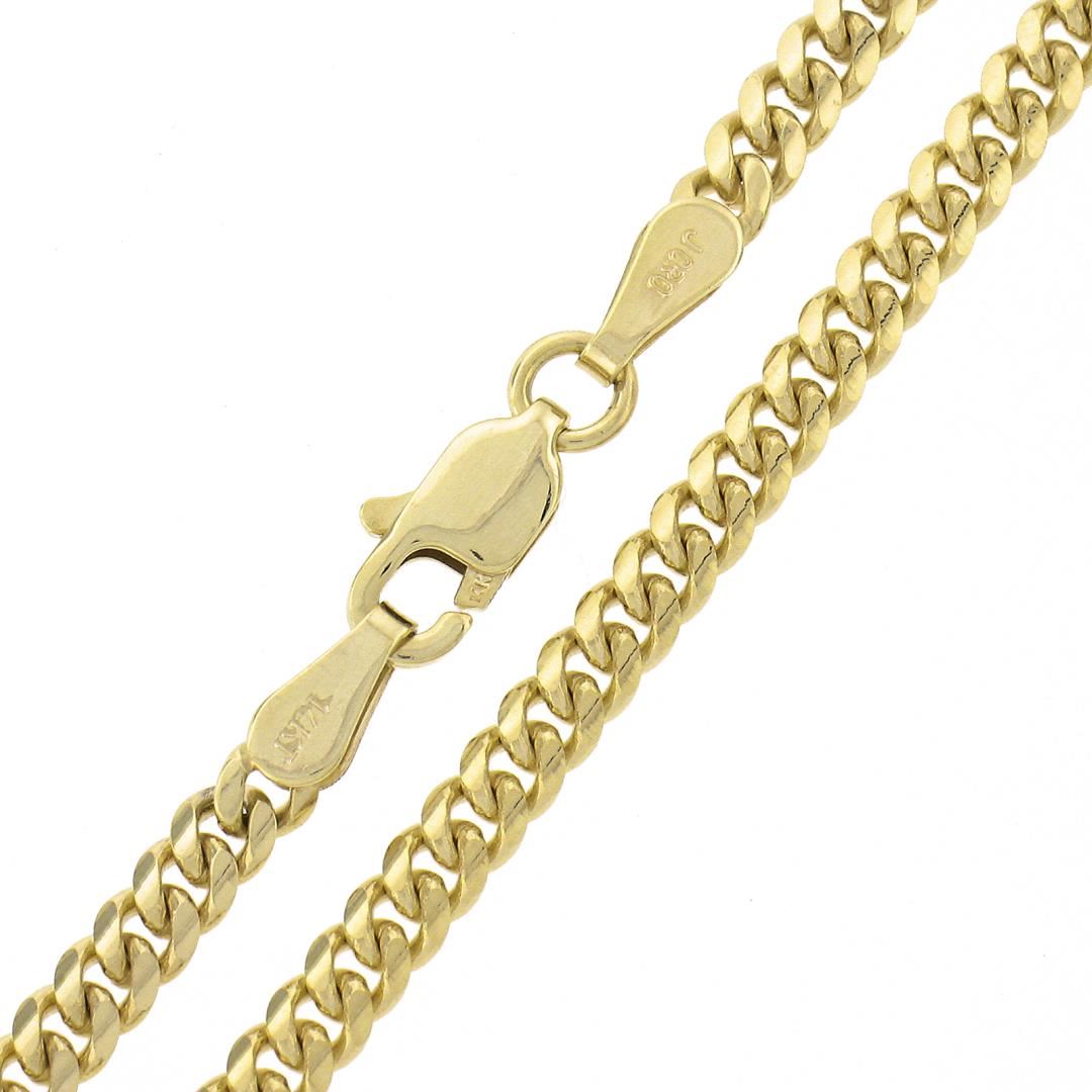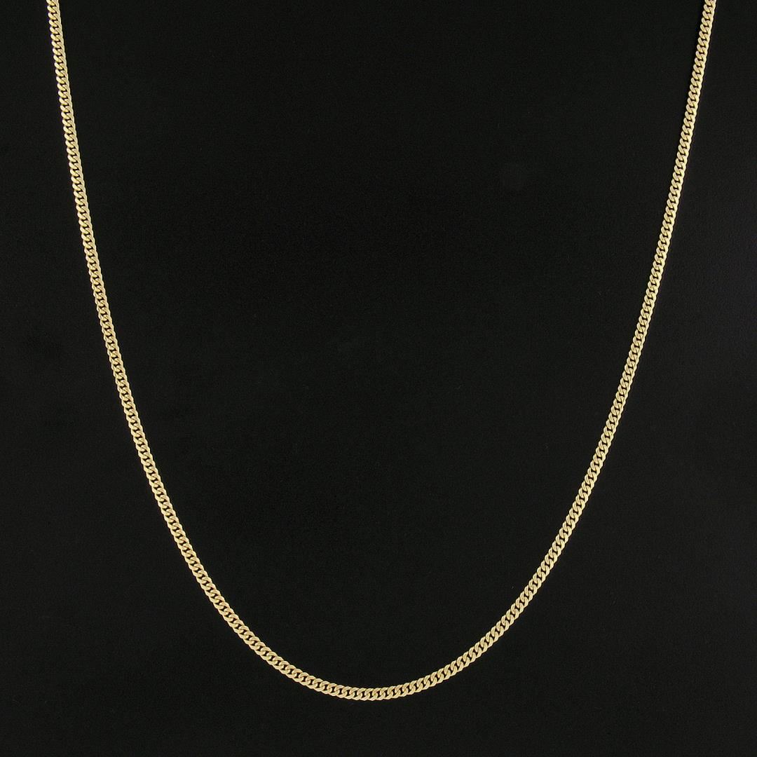 A new solid 14k yellow gold curb link necklace. It weighs a total of 12.70 grams, measures 2.8mm wide, and measures 22 inches in length.