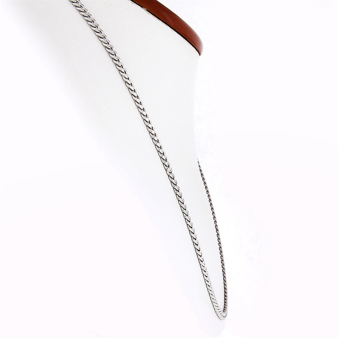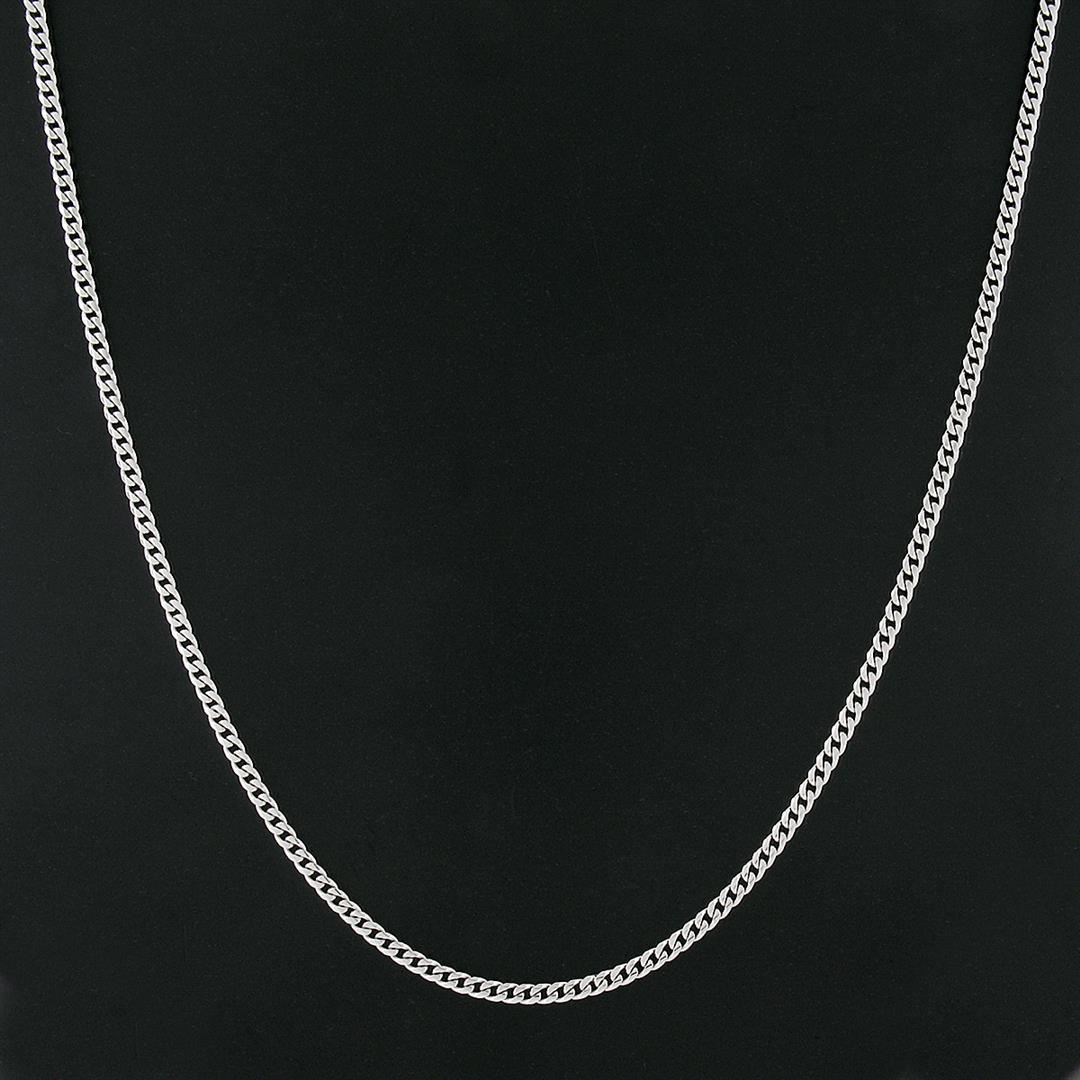 A new solid 14k white gold Cuban curb necklace. It weighs a total of 21.4 grams, measures 3.3mm wide, and measures 24 inches in length.