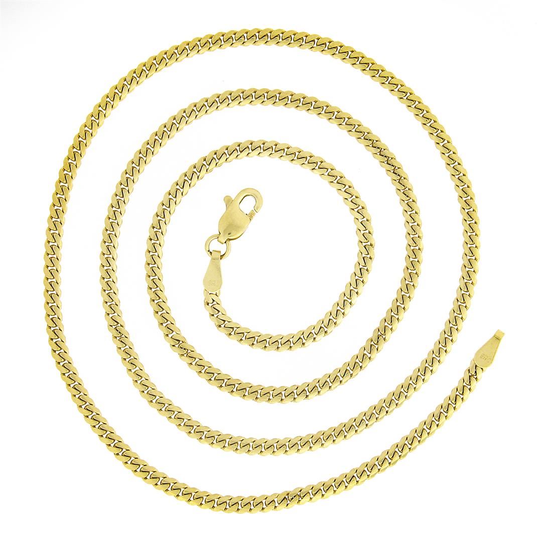 A new solid 14k yellow gold cuban curb link chain necklace. It weighs a total of 10.6 grams, measures 2.6mm wide, and measures 20 inches in length.