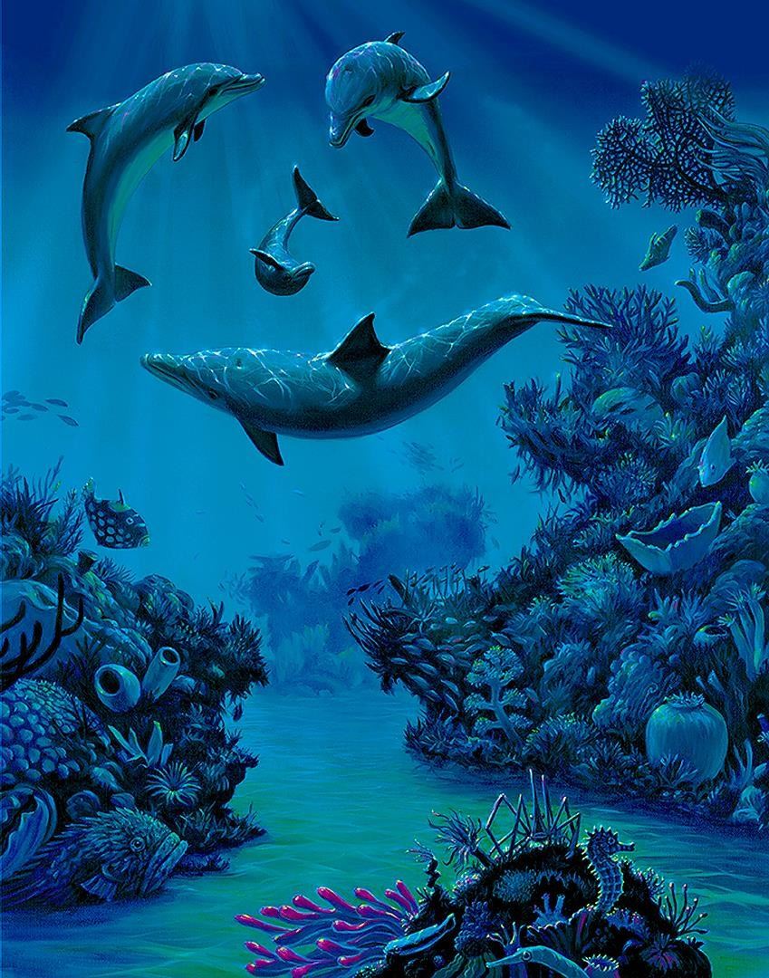 Giclee on canvas, limited edition embellished with glitter by Charles Lynn Bragg. It's a full moon and it's playtime for a dophin family. 24 x 30