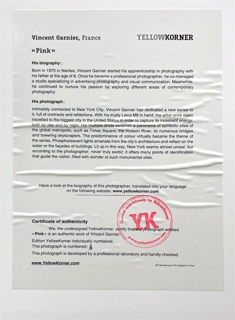 Pink NYC Skyline Vincent Garnier YellowKorner Certified Photograph. Certificate of Authenticity from YellowKorner affixed to the back. Matted Dimensions 16"x20". Protected with Clear Mylar Sleeve.