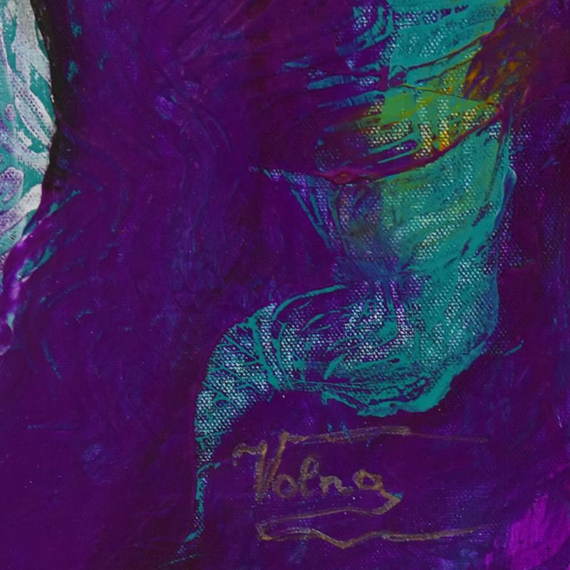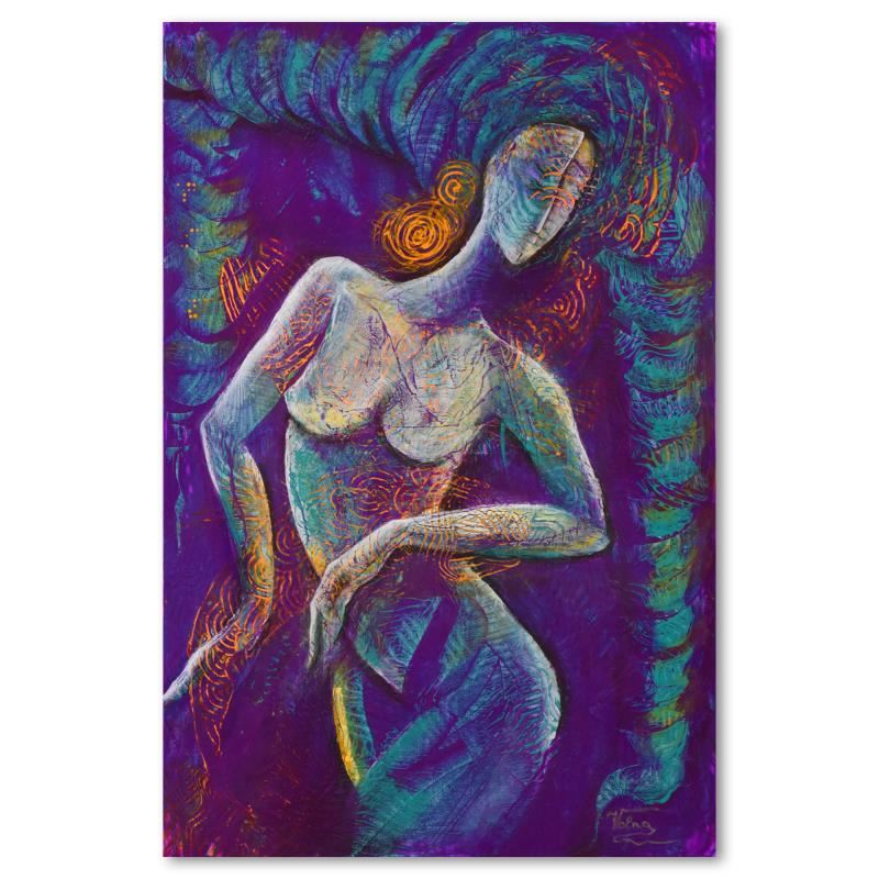 "Naked Universe" is an original acrylic painting on stretched canvas by Nadia Volna, hand signed by the artist. This piece is painted with light-reactive black light paint that reveals brilliant colors when viewed under incandescent light. This piece comes with a blacklight flashlight (batteries not included). This piece comes with a blacklight flashlight (batteries not included). Includes Letter of Authenticity. Measures approx. 24" x 36" (image).