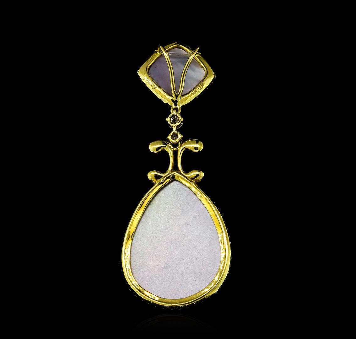 One electronically tested 18KT yellow gold ladies cast & assembled quartz triplet and diamond pendant. The pendant features a quartz triplet set within a diamond bezel supported by a black diamond design and two stacked diamonds suspended from another quartz triplet set in a diamond bezel, completed by a hidden bail. Bright and anodized finish. Trademark is MICHA. Identified with markings of '18K 750'. Condition is good. Containing: Two prong set round brilliant cut diamonds, measuring 3.00 - 2.90 x 1.77mm (depth est.) approximate total weight of 2 Stones = 0.19ct. Graded in the setting. Clarity SI-2 to I-1. Color: F - G Seventy-Two prong set round brilliant cut diamonds, measuring 1.40 - 1.30 x 0.81mm (depth est.) approximate total weight of 72 Stones = 0.72ct. The clarity grade reflects the entire range of clarity for this group. Graded in the setting. Clarity SI-1 to I-2. Color: E - G Thirty-Two prong set round brilliant cut diamonds, measuring 1.50 - 1.10 x 0.78mm (depth est.) approximate total weight of 32 Stones = 0.26ct. Indications of multiple laboratory enhancements. The specific gravity of black diamond is 3.120 to 3.165. Diamond tester results are non reactive. Graded in the setting. Clarity Déclassé, Color Fancy Black; Irradiated. One pear cabochon cut natural , measuring 25.00 x 18.00 x 3.50mm, approximate weight of 0.00ct. Transmitting light with no distortion, transparent. Graded in the setting. One square cushion cabochon cut natural , measuring 10.00 x 10.00 x 3.00mm, approximate weight of 0.00ct. Transmitting light with no distortion, transparent. Graded in the setting. Total Weight of Diamonds 1.17ct.. Total Weight of Pendant 7.25gm. AIG Appraised at $4,510.00.