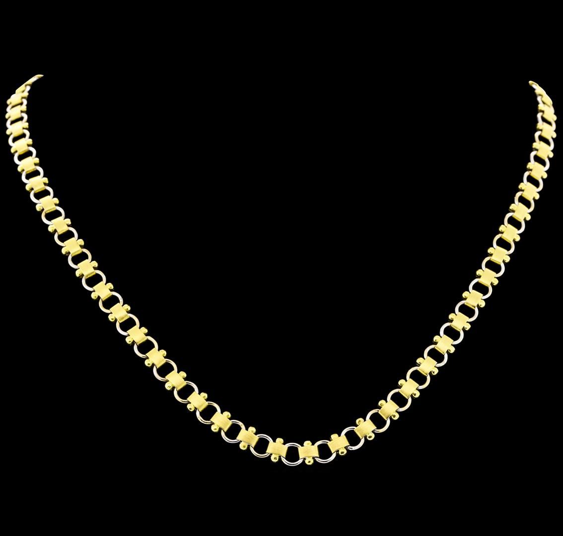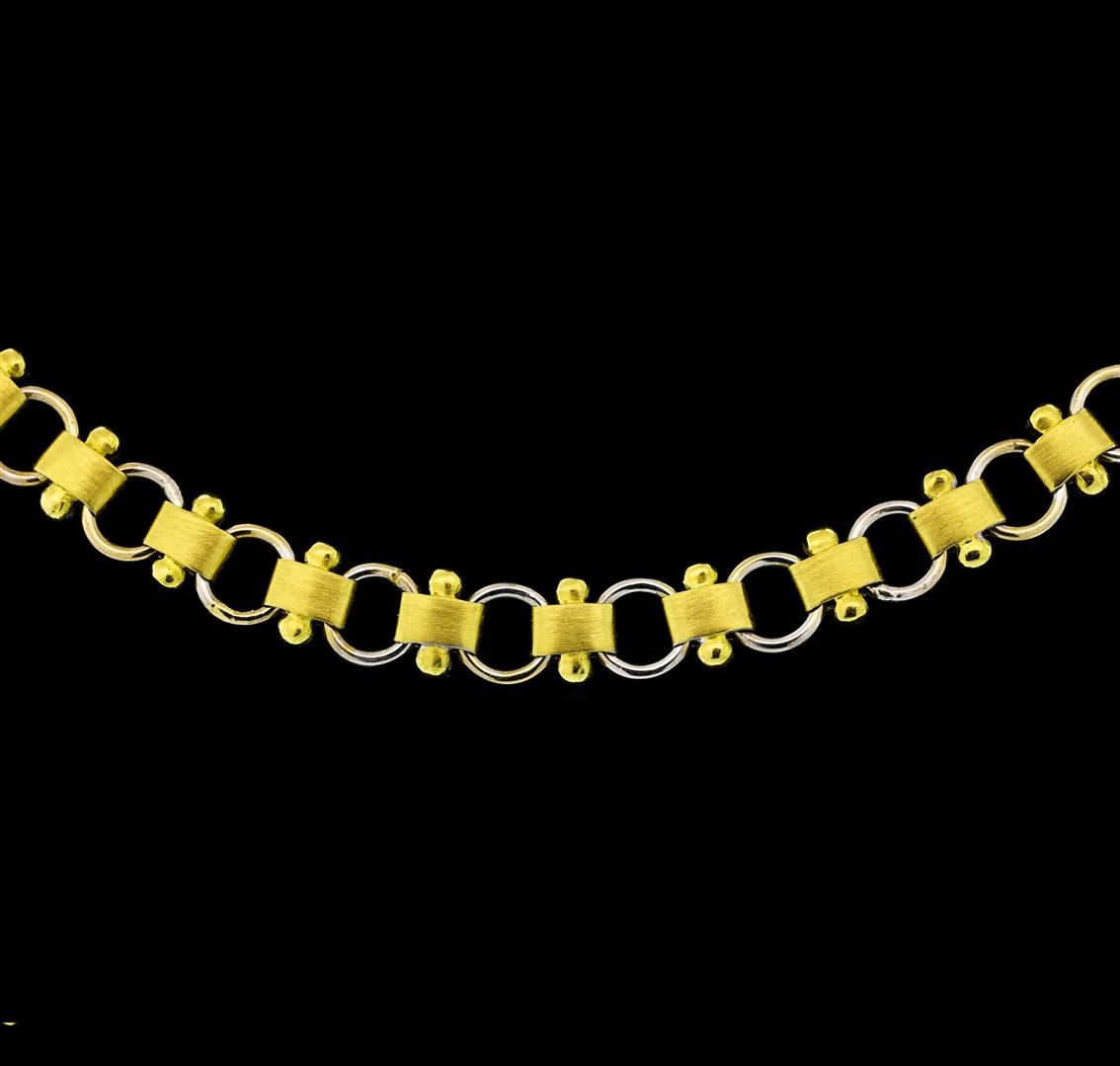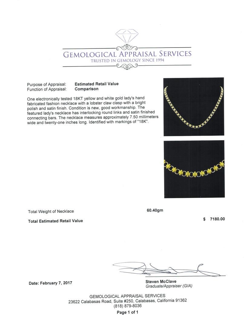One electronically tested 18KT yellow and white gold lady's hand fabricated fashion necklace with a lobster claw clasp with a bright polish and satin finish. The featured lady's necklace has interlocking round links and satin finished connecting bars. The necklace measures approximately 7.50 millimeters wide and twenty-one inches long. Identified with markings of '18K'. Condition is new, good workmanship.. Total Weight of Necklace 60.40gm GAS Appraised at $7,180.00.