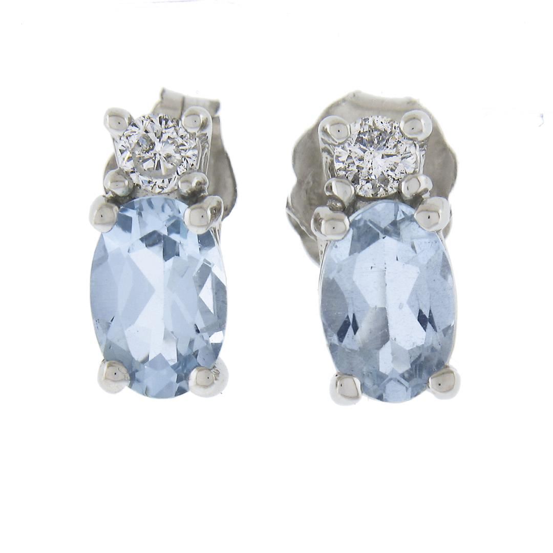 A new solid 10k white gold stud earrings, with 2 oval cut natural aquamarine (0.80ctw), and 2 round cut natural diamonds ( G/H - SI1/SI2 ; 0.10ctw). The earrings measure approximately 8.6x4.1mm and weigh a total of 1.1 grams.