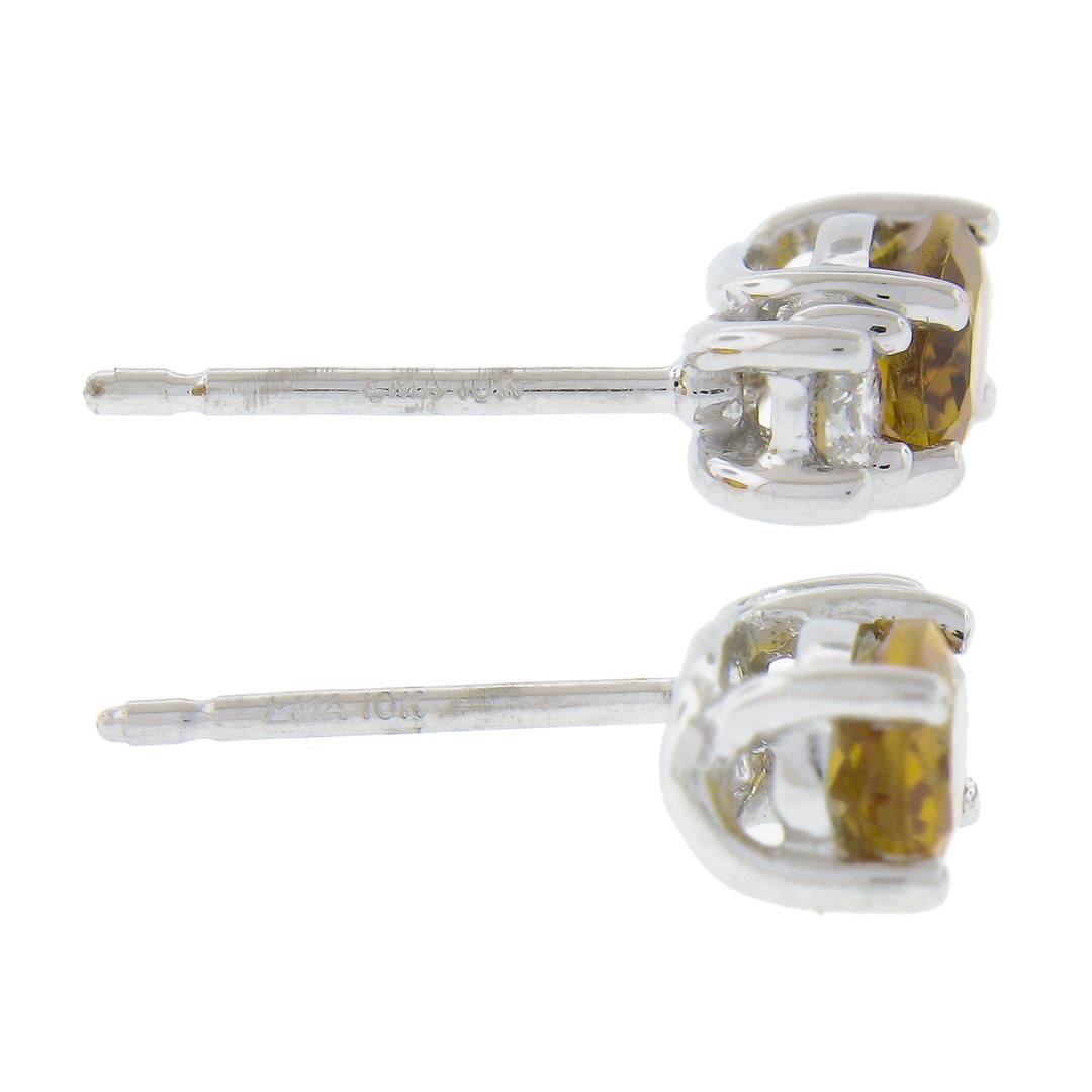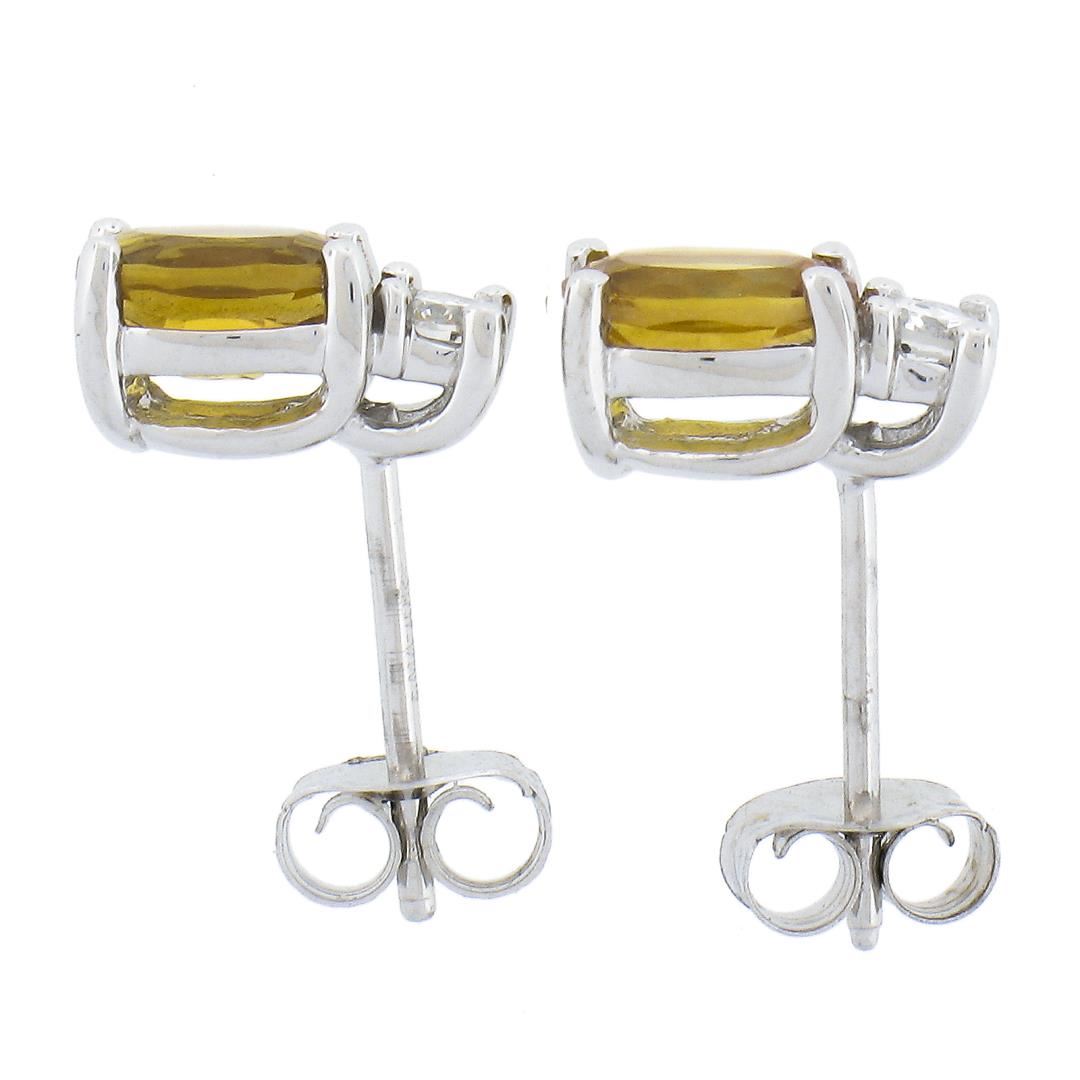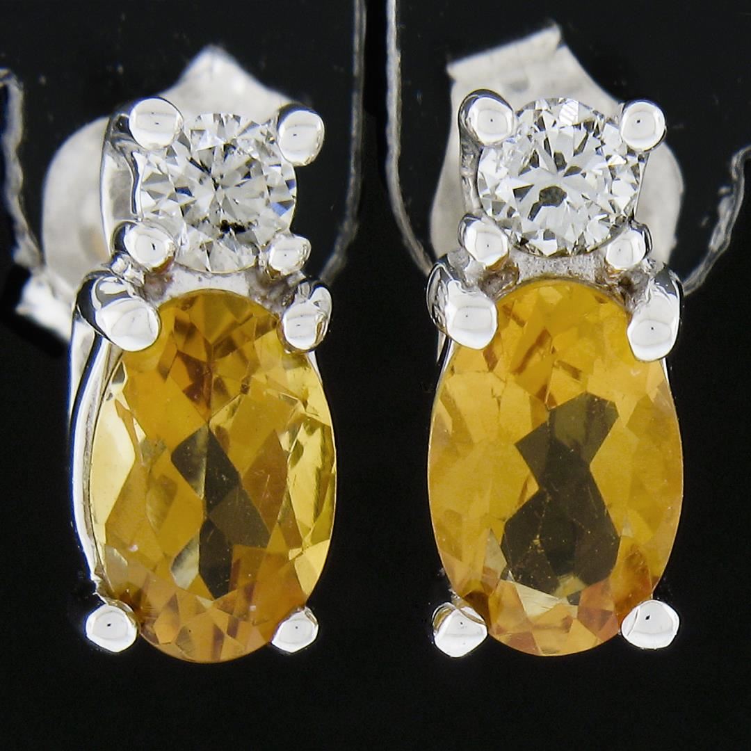 A new solid 10k white gold stud earrings, with 2 oval cut natural citrines (0.90ctw ), and 2 round cut natural diamonds (G/H - SI1/SI2 ; 0.10ctw). The earrings measure approximately 8.7x4.1mm and weigh a total of 1.1 grams.